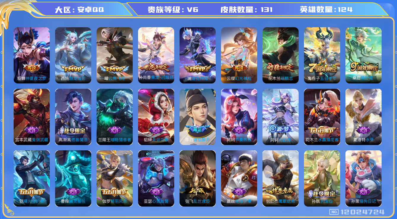[12024724]V6 7传说 124英雄 131皮肤 可修改实名 优质装备:云鹰飞将(小将军),仲夏夜之梦(大飞蛾),游龙清影(小青龙),澜逐花归海 传说皮:乘龙·问璇玑(孙尚香年限),幻光神枪 珍宝阁皮:妄想食味 限定皮:鸣野蒿,瑞麟志(木兰年限),五谷丰年 史诗皮:化蝶舞,星界战将,谪仙醉月,茶境仙,紫霞仙子,电玩小子(小书包),特工魅影,永昼,高渐离燃音魔法,蒙恬荣光圣徽,晚萤,猫狗日记-孙策,乱世虎臣,节奏热浪,摇滚巨星,水果甜心,暗隐猎兽者,幽灵船长,鬼剑武藏,心灵战警,纤云弄巧,水晶猎龙者,曙光守护者,箭羽风息,圣诞狂欢,圣诞恋歌,鹰眼统帅,魅力维加斯,黎明之约