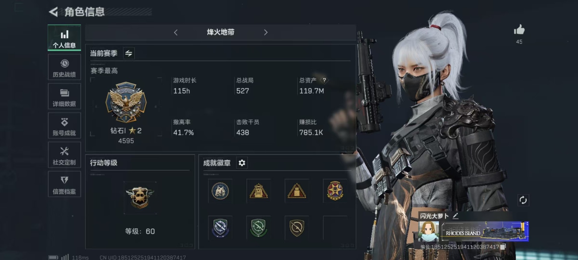 [12024903]总资产:119.7M 4干员外观 1近战传说 13传说枪械 哈夫币:22.594K 可二次 可修改实名 安全保护中 优质装备:近战-北极星,顶级安全箱(3x3) 烽火地带段位:钻石 全面战场段位:军士长 传说武器皮肤:SR-25射手步枪-水墨云图,SCAR-H战斗步枪-水墨云图,SMG45冲锋枪-骑士,UZI冲锋枪-特斯拉线圈,AK-12突击步枪-特斯拉线圈,SR-3M紧凑突击步枪-特斯拉线圈,勇士冲锋枪-能天使-午夜邮差,复合弓-黑-天际线,725双管霰弹枪-送葬人-无题密令,M4A1突击步枪-阿米娅,CAR-15突击步枪-阿米娅,AK-12突击步枪-夜鹰 史诗武器皮肤:AK-12突击步枪-原型机(典藏),SR-3M紧凑突击步枪-英雄,PKM通用机枪-蝮蛇,Ash-12战斗步枪-守夜人,M16A4突击步枪-竞赛选手,PKM通用机枪-守夜人,M700狙击步枪-守夜人,SG552突击步枪-尖端治疗,SR-25射手步枪-尖端治疗,M1014霰弹枪-林中猎手,MP5冲锋枪-深海恐惧,SG552突击步枪-深海恐惧,AKM突击步枪-林中猎手,SVD狙击步枪-暗夜猎手,SV-98狙击步枪-林中猎手,PTR-32突击步枪-英雄,M250通用机枪-囚徒,SV-98狙击步枪-囚徒,腾龙突击步枪-无垢,MP7冲锋枪-无垢,SVD狙击步枪-荒野求生,SR-3M紧凑突击步枪-荒野求生,沙漠之鹰-曙光,Vector冲锋枪-阿萨拉文明,SVD狙击步枪-阿萨拉工艺,QSZ92G-风林火山 干员外观:骇爪-水墨云图,无名-夜鹰,蜂医-送葬人·无题密令(S5),露娜-黑·天际线