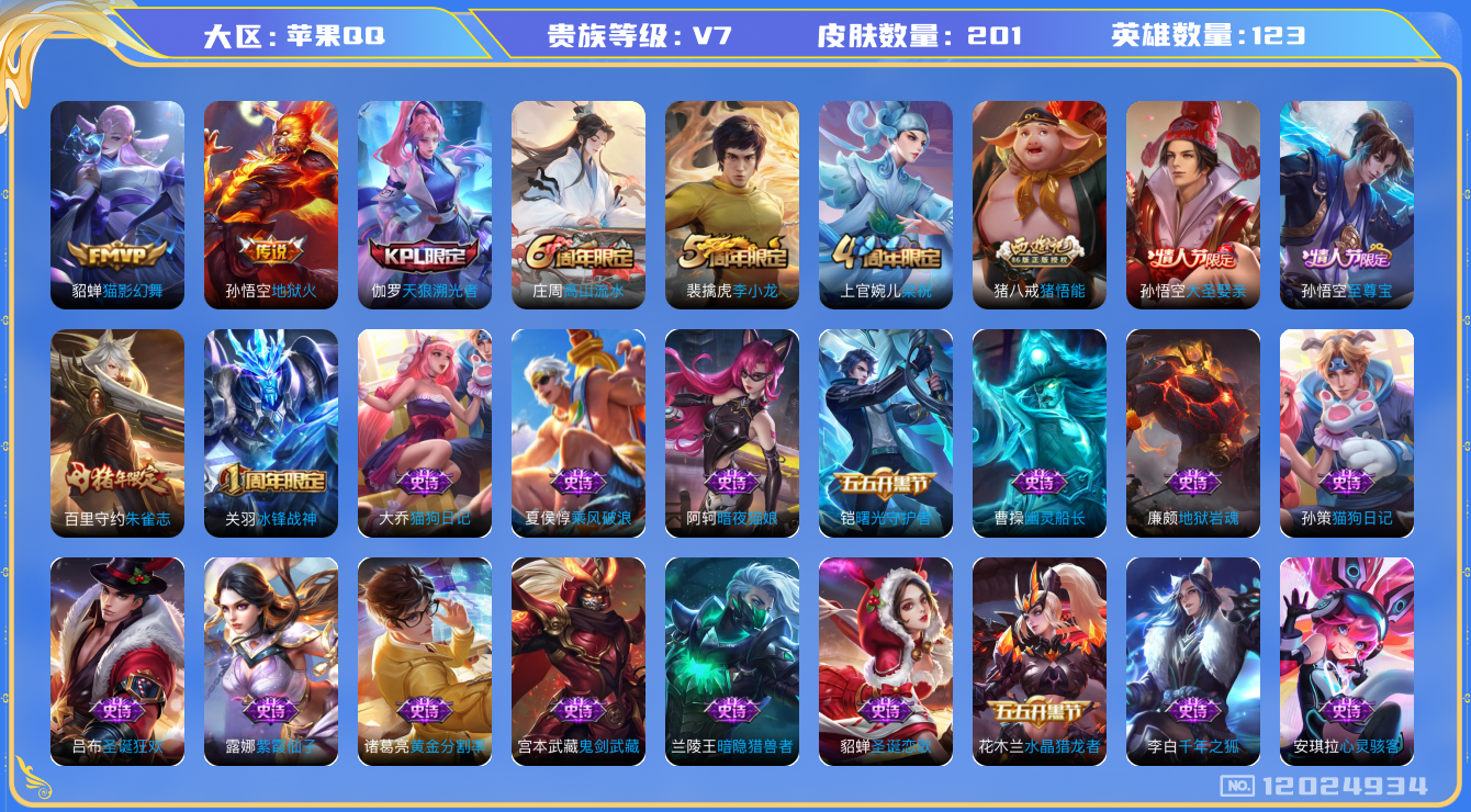 - [11997597]V7 1典藏 5传说 123英雄 153皮肤 可修改实名 优质装备:鸣剑·曳影,李逍遥,超时空战士-狄仁杰 珍宝阁皮:女武神,玩趣恶龙 限定皮:鸣野蒿,异界灵契(白毛香),神威(电光马子),高山流水,五谷丰年,梁祝,天狼溯光者,李小龙,朱雀志(守约年限),孙行者,蜜橘之夏,寅虎·赤拳(老虎年限) 史诗皮:化蝶舞,特工魅影,江河有灵,魅语,蒙恬荣光圣徽,冰冠公主,偶像歌手,晚萤,电玩·爆裂旋风,乱世虎臣,修罗,女仆咖啡,摇滚巨星,水果甜心,功夫厨神,暗隐猎兽者,幽灵船长,鬼剑武藏,暗渊魔法,心灵战警,天秀·启明,地狱岩魂,纤云弄巧,拒霜思,缤纷独角兽,水晶猎龙者,金属风暴,原初追逐者,圣诞恋歌,鹰眼统帅,暗夜贵公子,黎明之约,赏金猎手,无心,未来纪元-赵云