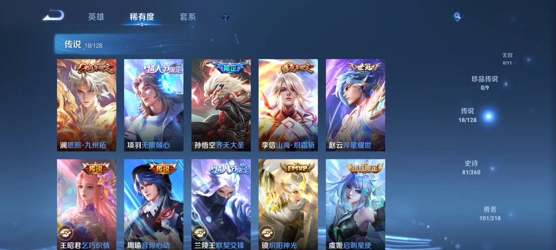 - [12145861]V7 1典藏 8传说 125英雄 181皮肤 可修改实名 优质装备:鸣剑·曳影,久胜战神,澜逐花归海 传说皮:乘龙·问璇玑(孙尚香年限),乘龙·淬吴钩(孙策年限),续相思,幻光神枪 珍宝阁皮:妄想食味,万物之道 限定皮:愿照·众生和(妲己年限),鸣野蒿,五谷丰年,梁祝 史诗皮:器灵·浮梦炉,绮世丹青,化蝶舞,石田雨龙,茶境仙,琥珀纪元伽罗,蔬乡物语(鲁班七号),紫霞仙子,特工魅影,江河有灵,雪夜绮愿(周瑜),真我赫兹(百里守约),魅语,高渐离燃音魔法,偶像歌手,末日机甲-吕布,猫狗日记-大乔,时之恋人-孙尚香,节奏热浪,女仆咖啡,摇滚巨星,水果甜心,星夜王子,心灵骇客,功夫厨神,暗隐猎兽者,鬼剑武藏,心灵战警,拒霜思,缤纷独角兽,乘风破浪,金属风暴,圣诞狂欢,鹰眼统帅,魅力维加斯,赏金猎手,无心