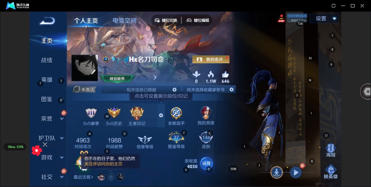- PX_2095941-实名: 可修改 贵族等级: V4 英雄数: 63 皮肤数: 35 传说皮: 山海·琳琅生 限定皮: 山海·碧波行,鸣野蒿