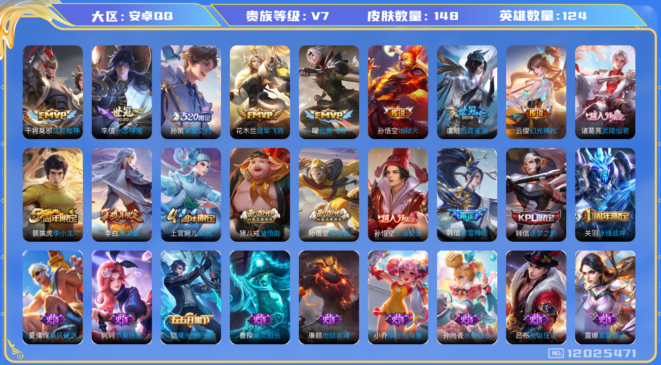 [12025471]V7 10传说 124英雄 148皮肤 可修改实名 优质装备:冠军飞将,云鹰飞将(小将军),久胜战神,一念神魔,云霓雀翎,地狱火,挚爱之约 传说皮:幻光神枪 珍宝阁皮:优雅恋人 限定皮:凤求凰(白切鸡),武陵仙君(小桃花),傲雪梅枪,冰锋战神,梁祝,李小龙,逐梦之影,孙行者,猪悟能,大圣娶亲 史诗皮:紫霞仙子,白龙吟,千年之狐,晚萤,节奏热浪,修罗,女仆咖啡,水果甜心,星夜王子,暗隐猎兽者,幽灵船长,鬼剑武藏,地狱岩魂,繁星吟游(呼啦呼啦),拒霜思,缤纷独角兽,乘风破浪,逐浪之夏,水晶猎龙者,曙光守护者,原初追逐者,圣诞狂欢,鹰眼统帅,魅力维加斯,赏金猎手,无心