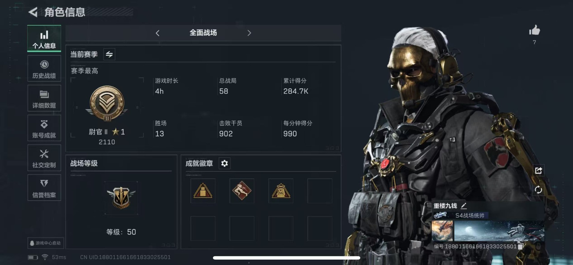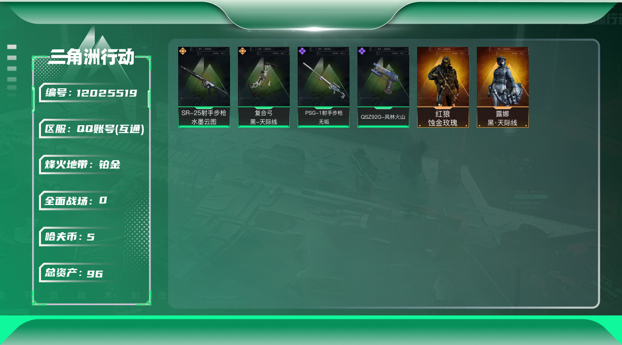 [12025519]总资产:96.9M 2干员外观 2传说枪械 哈夫币:5.077K 可二次 可修改实名 烽火地带段位:铂金 全面战场段位:尉官 传说武器皮肤:SR-25射手步枪-水墨云图,复合弓-黑-天际线 史诗武器皮肤:PSG-1射手步枪-无垢,QSZ92G-风林火山 干员外观:红狼-蚀金玫瑰,露娜-黑·天际线