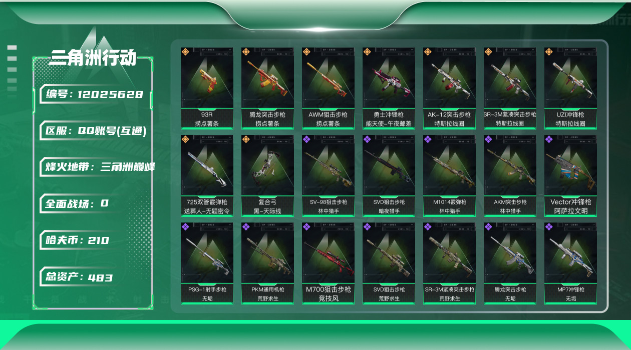 [12025628]总资产:483.4M 1干员外观 9传说枪械 哈夫币:210K 可二次 可修改实名 优质装备:顶级安全箱(3x3),非洲之心 烽火地带段位:三角洲巅峰 全面战场段位:列兵 传说武器皮肤:复合弓-黑-天际线,AWM狙击步枪-捞点薯条,腾龙突击步枪-捞点薯条,93R-捞点薯条,AK-12突击步枪-特斯拉线圈,SR-3M紧凑突击步枪-特斯拉线圈,UZI冲锋枪-特斯拉线圈,勇士冲锋枪-能天使-午夜邮差,725双管霰弹枪-送葬人-无题密令 史诗武器皮肤:SVD狙击步枪-暗夜猎手,M16A4突击步枪-竞赛选手,PKM通用机枪-荒野求生,AKM突击步枪-林中猎手,SR-3M紧凑突击步枪-荒野求生,M1014霰弹枪-林中猎手,SV-98狙击步枪-林中猎手,SVD狙击步枪-荒野求生,腾龙突击步枪-无垢,MP7冲锋枪-无垢,PSG-1射手步枪-无垢,Vector冲锋枪-阿萨拉文明,M700狙击步枪-竞技风 干员外观:蜂医-送葬人·无题密令(S5)