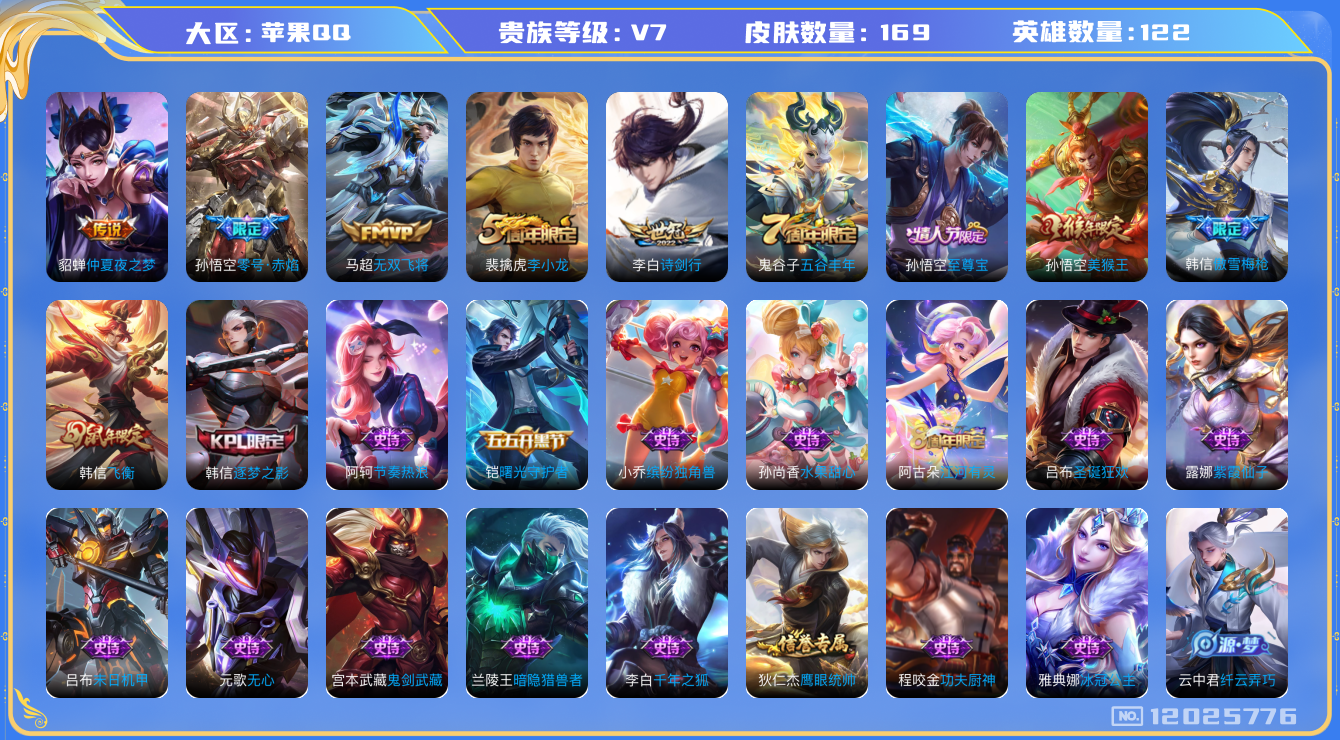 - [11820070]V7 1典藏 14传说 124英雄 211皮肤 可修改实名 优质装备:鸣剑·曳影,黄金狮子座,黄金射手座,久胜战神,炽阳神光,时之恋人-刘备(电焊工),无双飞将,金乌负日,涂山容容 传说皮:乘龙·问璇玑(孙尚香年限),乘龙·铭钟鼎(赵云年限),乘龙·淬吴钩(孙策年限),貂蝉曦玄引,吕布曦玄引 珍宝阁皮:胡桃夹子 限定皮:逐霄战戟,鸣野蒿,白晶晶,五谷丰年,梁祝,如梦令-嫦娥,如梦令-后羿,寅虎·赤拳(老虎年限),匿光启智者 史诗皮:鸭鸭历险记-刘禅,化蝶舞,星界战将,龙之律动,石田雨龙,百相守梦-周瑜,破空之剑,琥珀纪元伽罗,决胜骁骑,超元猎域,乘龙·聚宝船(安琪拉年限),乘龙·忆丹青(大乔年限),百相守梦-百里守约,百相守梦-黄忠,织梦人,遇见神鹿,紫霞仙子,黄金分割率,特工魅影,千年之狐,永昼,江河有灵,真我赫兹(镜),魅语,高渐离燃音魔法,蒙恬荣光圣徽,无限星赏官,偶像歌手,晚萤,末日机甲-吕布,时之恋人-孙尚香,乱世虎臣,摇滚巨星,水果甜心,星夜王子,心灵骇客,德古拉伯爵,暗隐猎兽者,幽灵船长,鬼剑武藏,暗渊魔法,天秀·启明,舞动绿茵,地狱岩魂,诗语江南,纤云弄巧,缤纷独角兽,乘风破浪,逐浪之夏,水晶猎龙者,曙光守护者,箭羽风息,原初追逐者,鹰眼统帅,魅力维加斯,未来纪元-赵云