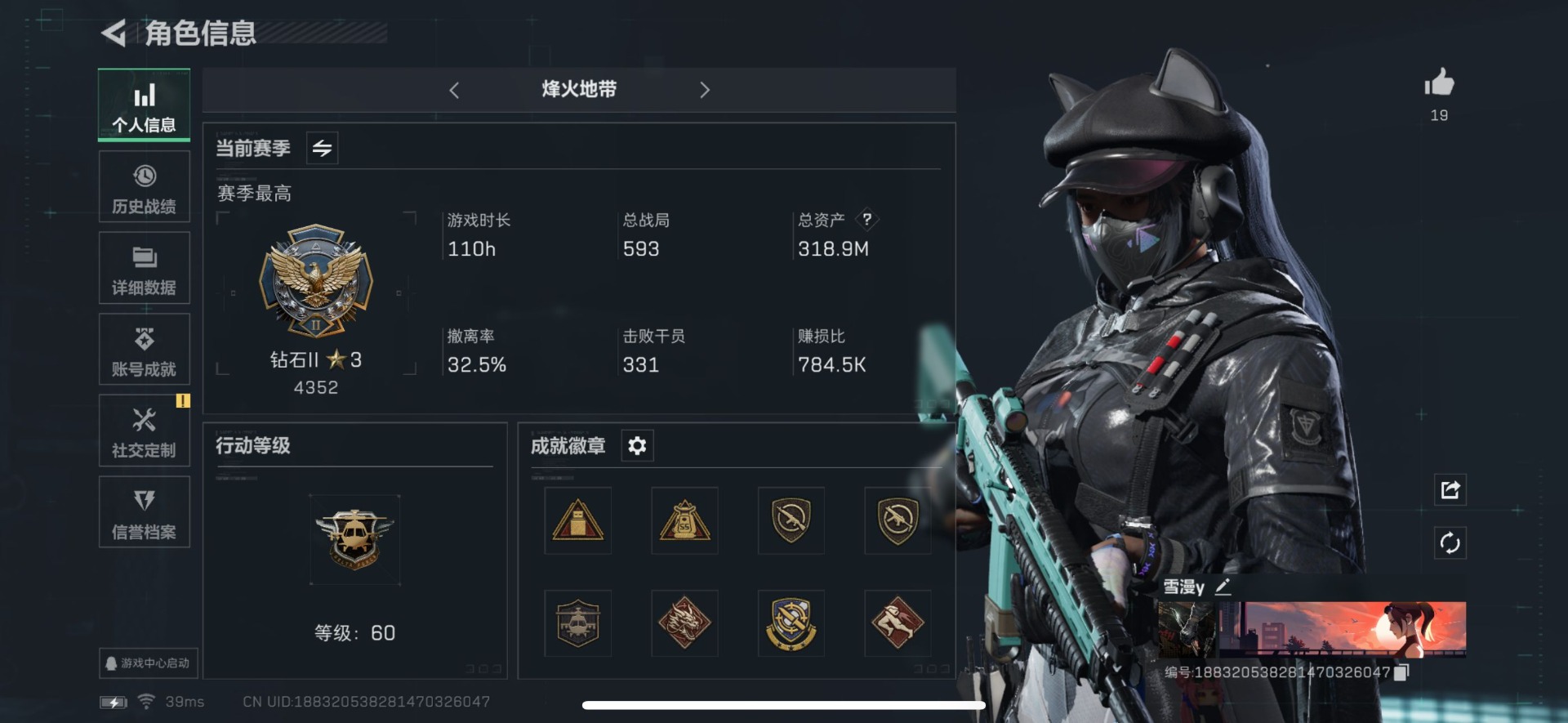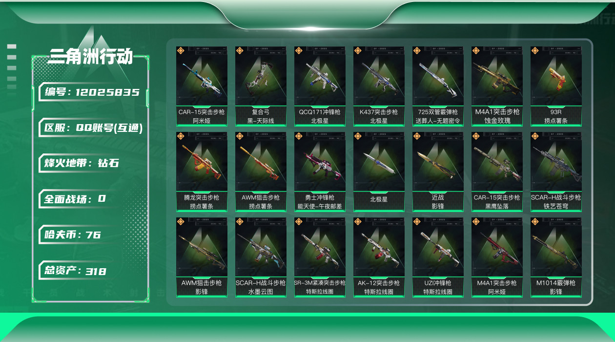 [12025835]总资产:318.9M 6干员外观 2近战传说 23传说枪械 哈夫币:76.066K 可二次 可修改实名 优质装备:近战-影锋,近战-北极星,顶级安全箱(3x3) 烽火地带段位:钻石 全面战场段位:上等兵 传说武器皮肤:SCAR-H战斗步枪-水墨云图,M1014霰弹枪-影锋,AWM狙击步枪-影锋,SCAR-H战斗步枪-铁艺苍穹,SMG45冲锋枪-骑士,UZI冲锋枪-特斯拉线圈,AWM狙击步枪-捞点薯条,腾龙突击步枪-捞点薯条,93R-捞点薯条,AK-12突击步枪-特斯拉线圈,SR-3M紧凑突击步枪-特斯拉线圈,勇士冲锋枪-能天使-午夜邮差,复合弓-黑-天际线,K437突击步枪-北极星,QCQ171冲锋枪-北极星,725双管霰弹枪-送葬人-无题密令,M4A1突击步枪-阿米娅,CAR-15突击步枪-阿米娅,AK-12突击步枪-夜鹰,M4A1突击步枪-蚀金玫瑰,CAR-15突击步枪-黑鹰坠落 史诗武器皮肤:PSG-1射手步枪-原型机(典藏),QBZ95-1突击步枪-ACE,AUG突击步枪-特勤执行,M4A1突击步枪-特勤执行,Vector冲锋枪-红色彗星,PTR-32战斗步枪-ACE,SKS射手步枪-ACE,AUG突击步枪-蝮蛇,M700狙击步枪-蝮蛇,PKM通用机枪-蝮蛇,G3战斗步枪-战场英杰,M16A4突击步枪-竞赛选手,PKM通用机枪-守夜人,AS Val突击步枪-尖端治疗,M700狙击步枪-守夜人,SG552突击步枪-尖端治疗,SR-25射手步枪-尖端治疗,M1014霰弹枪-林中猎手,MP5冲锋枪-深海恐惧,勇士冲锋枪-深海恐惧,AKM突击步枪-林中猎手,.357左轮-幸运时刻,SVD狙击步枪-暗夜猎手,SV-98狙击步枪-林中猎手,PTR-32突击步枪-英雄,AS Val突击步枪-典狱官,PKM通用机枪-荒野求生,M250通用机枪-囚徒,腾龙突击步枪-无垢,MP7冲锋枪-无垢,PSG-1射手步枪-无垢,SVD狙击步枪-荒野求生,SR-3M紧凑突击步枪-荒野求生,M14射手步枪-黑鹰坠落,沙漠之鹰-曙光,Vector冲锋枪-阿萨拉文明,S12K霰弹枪-曙光,PKM通用机枪-英雄,M700狙击步枪-竞技风,AUG突击步枪-战术迷彩 干员外观:红狼-蚀金玫瑰,威龙-壮志凌云,骇爪-水墨云图,无名-夜鹰,蜂医-送葬人·无题密令(S5),露娜-黑·天际线