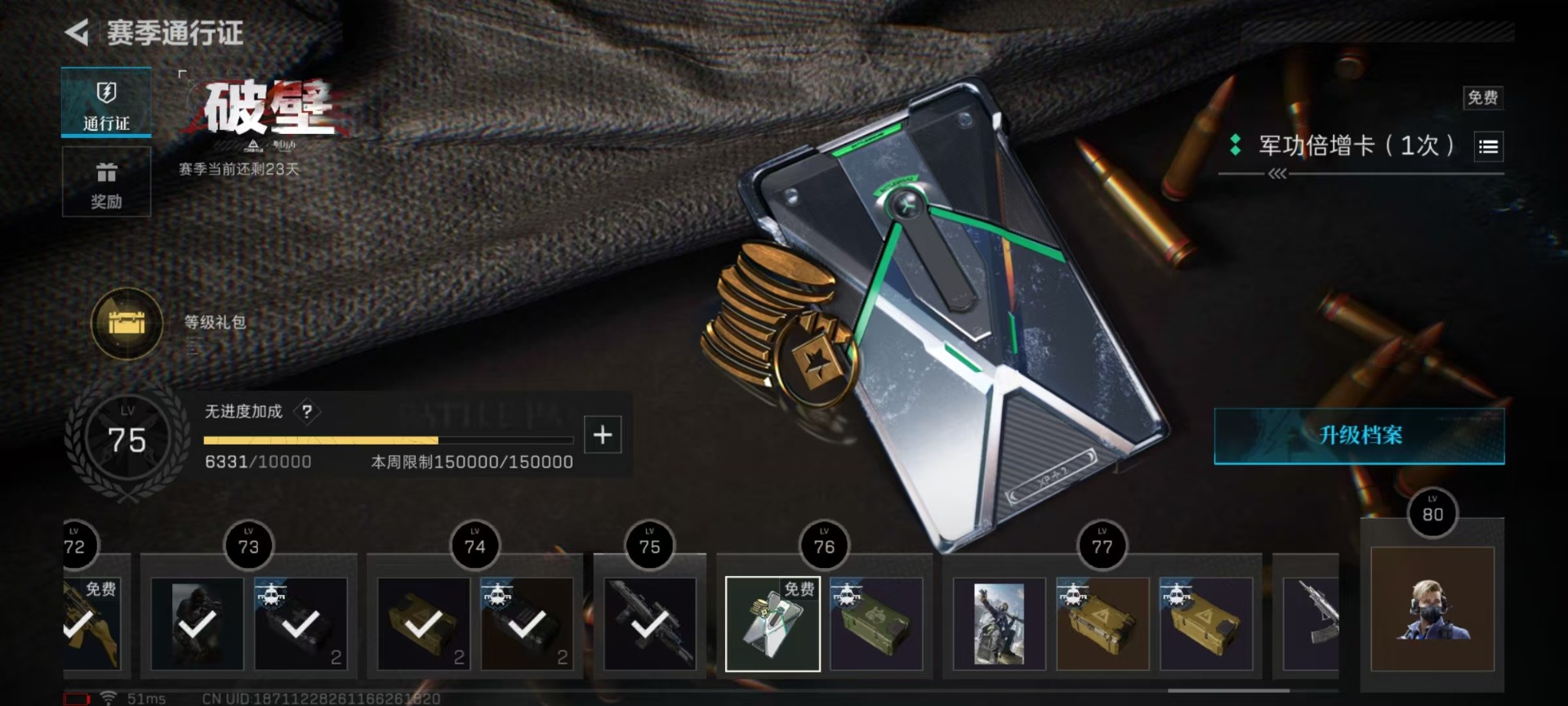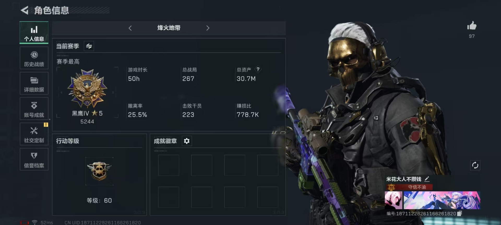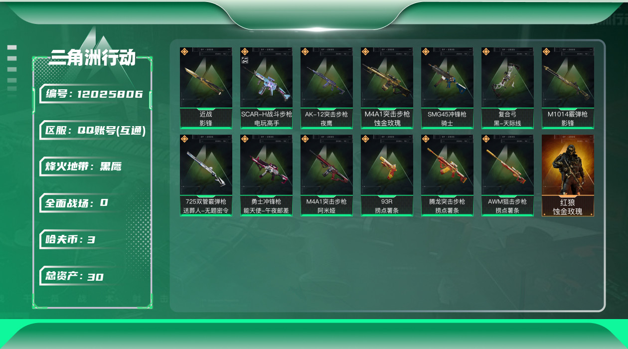 [12025806]总资产:30.7M 1干员外观 1近战传说 13传说枪械 哈夫币:3.840K 高级安全箱(9.17到期) 可二次 可修改实名 优质装备:近战-影锋,SCAR-H战斗步枪-电玩高手 烽火地带段位:黑鹰 全面战场段位:上等兵 传说武器皮肤:M1014霰弹枪-影锋,AK-12突击步枪-夜鹰,SMG45冲锋枪-骑士,M4A1突击步枪-阿米娅,复合弓-黑-天际线,AWM狙击步枪-捞点薯条,腾龙突击步枪-捞点薯条,93R-捞点薯条,勇士冲锋枪-能天使-午夜邮差,725双管霰弹枪-送葬人-无题密令,M4A1突击步枪-蚀金玫瑰 干员外观:红狼-蚀金玫瑰