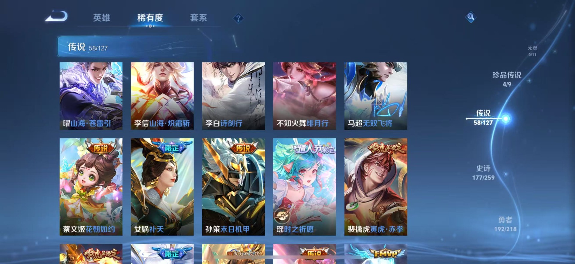 大乔白鹤梁神女,老夫子圣诞老人,甄姬女儿国国王,铠青龙志,廉颇寅虎·御盾,曹操天狼征服者,伽罗天狼溯光者,伽罗太华,赵云百木心枪,赵云龙胆,孙膑寅虎·展翼,干将莫邪冰霜恋舞曲,小乔纯白花嫁,孙尚香异界灵契,不知火舞绯月行,鲁班七号乒乒小将,鲁班七号寅虎·瑞焰,吕布御风骁将,后羿如梦令,露娜一生所爱,镜匿光追影者,周瑜真爱至上,诸葛亮时雨天司,公孙离祈雪灵祝,杨玉环寅虎·心曲,公孙离玉兔公主,兰陵王影龙天霄,司空震愿照·山河定,公孙离蜜橘之夏,貂蝉逐梦之音,裴擒虎梅西,裴擒虎李小龙,裴擒虎天狼狩猎者,裴擒虎寅虎·赤拳,上官婉儿梁祝,上官婉儿天狼绘梦者,李白诗剑行,花木兰默契交锋,花木兰青春决赛季,马可波罗逐梦之星,马可波罗山海·玄木吟,桑启鸣野蒿,猪八戒猪悟能,女娲补天,女娲愿照·千秋盛,孙悟空孙行者,孙悟空大圣娶亲,孙悟空至尊宝,百里玄策白虎志,马超神威,赵云引擎之心,盘古冰霜神祇,云中君时之祈愿,妲己愿照·众生和,韩信傲雪梅枪,韩信飞衡,韩信逐梦之影,百里守约朱雀志,蔡文姬愿照·福禄聚,瑶时之祈愿,澜愿照·九州拓,虞姬霸王别姬,虞姬愿照·岁时盈,嫦娥如梦令,关羽武圣,关羽冰锋战神