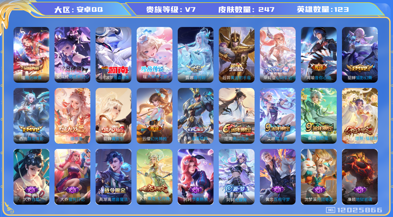 [12025866]V7 1典藏 3珍品传说 11传说 123英雄 247皮肤 可修改实名 优质装备:拾光映像(瑶典藏),怪盗基德,酷洛米之心,大耳狗之梦,黄金射手座,猫影幻舞,音你心动-周瑜,游龙清影(小青龙),霜月吟,朵莉亚心动手记,涂山容容 传说皮:貂蝉曦玄引,续相思,幻光神枪 珍宝阁皮:蔷薇恋人 限定皮:愿照·福禄聚(蔡文姬年限),逐霄战戟,陌上桑,鸣野蒿,高山流水 史诗皮:鸭鸭历险记-刘禅,化蝶舞,星界战将,龙之律动,茶境仙,幻珠鲛人,炽弈燎原,破空之剑,战舞者,涂山红红,东方月初,蒙犽顽岩魄,芈月浮光幕影,上官婉儿群星魔术团,奇遇星旅,蔬乡物语(鲁班七号),乘龙·忆丹青(大乔年限),百相守梦-百里守约,百相守梦-黄忠,织梦人,遇见神鹿,紫霞仙子,特工魅影,江河有灵,高渐离燃音魔法,冰冠公主,青蛇,白蛇,末日机甲-吕布,猫狗日记-孙策,猫狗日记-大乔,乱世虎臣,节奏热浪,女仆咖啡,水果甜心,星夜王子,心灵骇客,暗隐猎兽者,鬼剑武藏,心灵战警,地狱岩魂,纤云弄巧,拒霜思,缤纷独角兽,逐浪之夏,月团寄思,水晶猎龙者,箭羽风息,金属风暴,原初追逐者,圣诞恋歌,鹰眼统帅,魅力维加斯,未来纪元-赵云