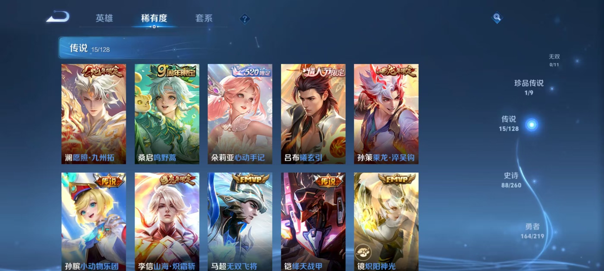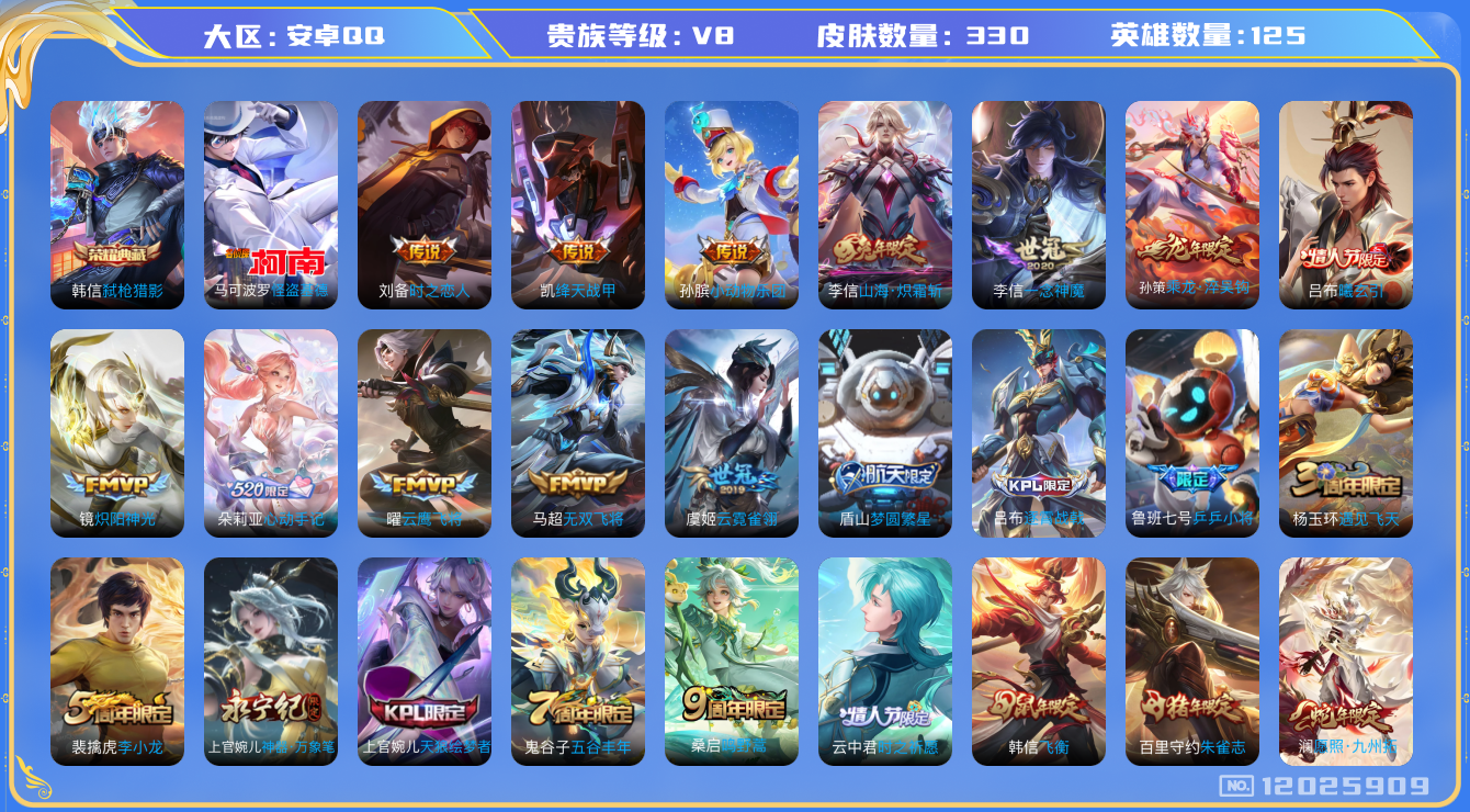 - [11772456]V9 2典藏 1无双 1珍品传说 24传说 125英雄 377皮肤 可修改实名 优质装备:鸣剑·曳影,拾光映像(瑶典藏),雪境奇遇-甄姬,怪盗基德,黄金狮子座,云鹰飞将(小将军),猫影幻舞,炽阳神光,一念神魔,云霓雀翎,仲夏夜之梦(大飞蛾),胖达荣荣,乞巧织情,时之恋人-刘备(电焊工),游龙清影(小青龙),山海·炽霜斩(李信年限),涂山容容 传说皮:星之鸣奏 珍宝阁皮:优雅恋人,蔷薇恋人,女武神 限定皮:愿照·九州拓(澜年限),愿照·岁时盈(虞姬年限),愿照·众生和(妲己年限),愿照·千秋盛(女娲年限),逐霄战戟,映山客,鸣野蒿,至尊宝,凤求凰(白切鸡),绯月行,时之彼端,魔法小厨娘,神威(电光马子),山海·碧波行(瑶年限),遇见飞天,高山流水,诗剑行,无限倾心-虞姬,五谷丰年,冰锋战神,游园惊梦,梁祝,天狼溯光者,天狼绘梦者,李小龙,逐梦之影,如梦令-嫦娥,如梦令-后羿,大圣娶亲,青春决赛季,冰霜恋舞曲,匿光追影者,寅虎·心曲(虎婆),时之奇旅-妲己,神器·万象笔,梦圆繁星,山海·玄木吟(马可年限) 史诗皮:器灵·浮梦炉,瑰影绮梦,化蝶舞,星界战将,龙之律动,茶境仙,百相守梦-黄忠,织梦人,遇见神鹿,紫霞仙子,电玩小子(小书包),黄金分割率,特工魅影,千年之狐,永昼,江河有灵,魅语,蒙恬荣光圣徽,无限星赏官,冰冠公主,偶像歌手,白蛇,晚萤,电玩·爆裂旋风,暗夜猫娘,银翎春语,末日机甲-吕布,猫狗日记-孙策,猫狗日记-大乔,时之恋人-孙尚香,乱世虎臣,节奏热浪,修罗,女仆咖啡,摇滚巨星,水果甜心,绅士熊喵,天才门将,星夜王子,心灵骇客,功夫厨神,德古拉伯爵,暗隐猎兽者,幽灵船长,鬼剑武藏,心灵战警,乐园奇幻夜,舞动绿茵,地狱岩魂,纤云弄巧,繁星吟游(呼啦呼啦),拒霜思,缤纷独角兽,乘风破浪,逐浪之夏,月团寄思,水晶猎龙者,曙光守护者,箭羽风息,金属风暴,原初追逐者,圣诞狂欢,圣诞恋歌,鹰眼统帅,暗夜贵公子,黎明之约,赏金猎手,无心,未来纪元-赵云