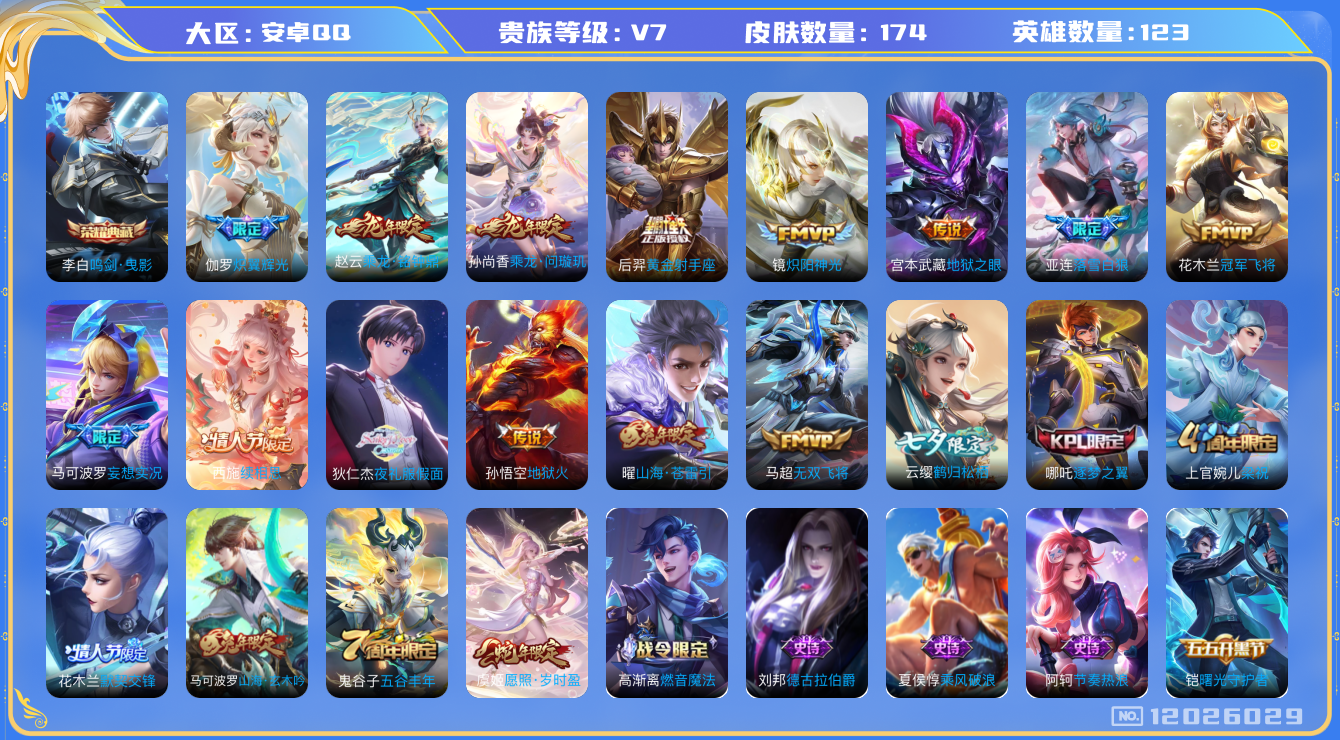 [12026029]V7 1典藏 16传说 123英雄 174皮肤 可修改实名 女号 优质装备:鸣剑·曳影,黄金射手座,冠军飞将,炽阳神光,地狱火,地狱之眼,无双飞将,山海·苍雷引(电光曜子),炽翼辉光(娃娃菜牛角包),妄想实况,鹤归松栖(云缨),夜礼服假面 传说皮:乘龙·问璇玑(孙尚香年限),乘龙·铭钟鼎(赵云年限),落雪白狼,续相思 珍宝阁皮:优雅恋人 限定皮:愿照·岁时盈(虞姬年限),五谷丰年,梁祝,逐梦之翼,默契交锋-花木兰,山海·玄木吟(马可年限) 史诗皮:苍鳞隐世,星界战将,谪仙醉月,石田雨龙,茶境仙,夜落电台,超元猎域,紫霞仙子,苍穹之光,特工魅影,千年之狐,永昼,江河有灵,匿光侦查者,百解令(蒙犽),高渐离燃音魔法,蒙恬荣光圣徽,无限星赏官,冰冠公主,偶像歌手,末日机甲-吕布,猫狗日记-孙策,时之恋人-孙尚香,节奏热浪,女仆咖啡,水果甜心,天才门将,德古拉伯爵,暗隐猎兽者,幽灵船长,鬼剑武藏,心灵战警,地狱岩魂,乘风破浪,水晶猎龙者,曙光守护者,金属风暴,原初追逐者,圣诞狂欢,鹰眼统帅,暗夜贵公子,魅力维加斯,赏金猎手