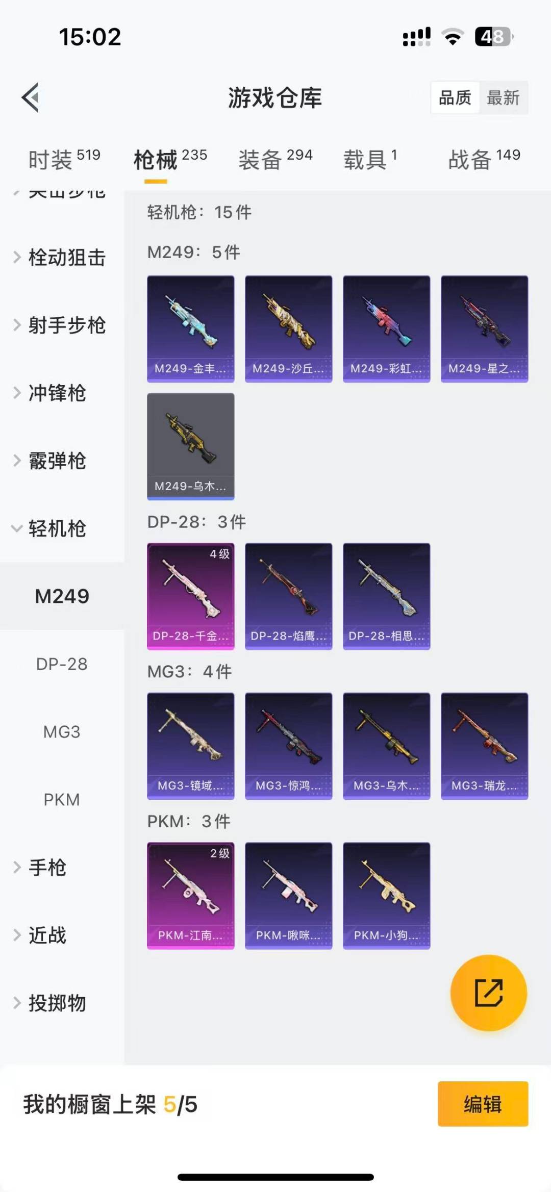M416-梨园星光,GROZA-林间仙鹿,M762-奇异狩猎者,M762-瑞龙福将,M762-风花雪月,S686-奇异狩猎者,M249-金丰海韵