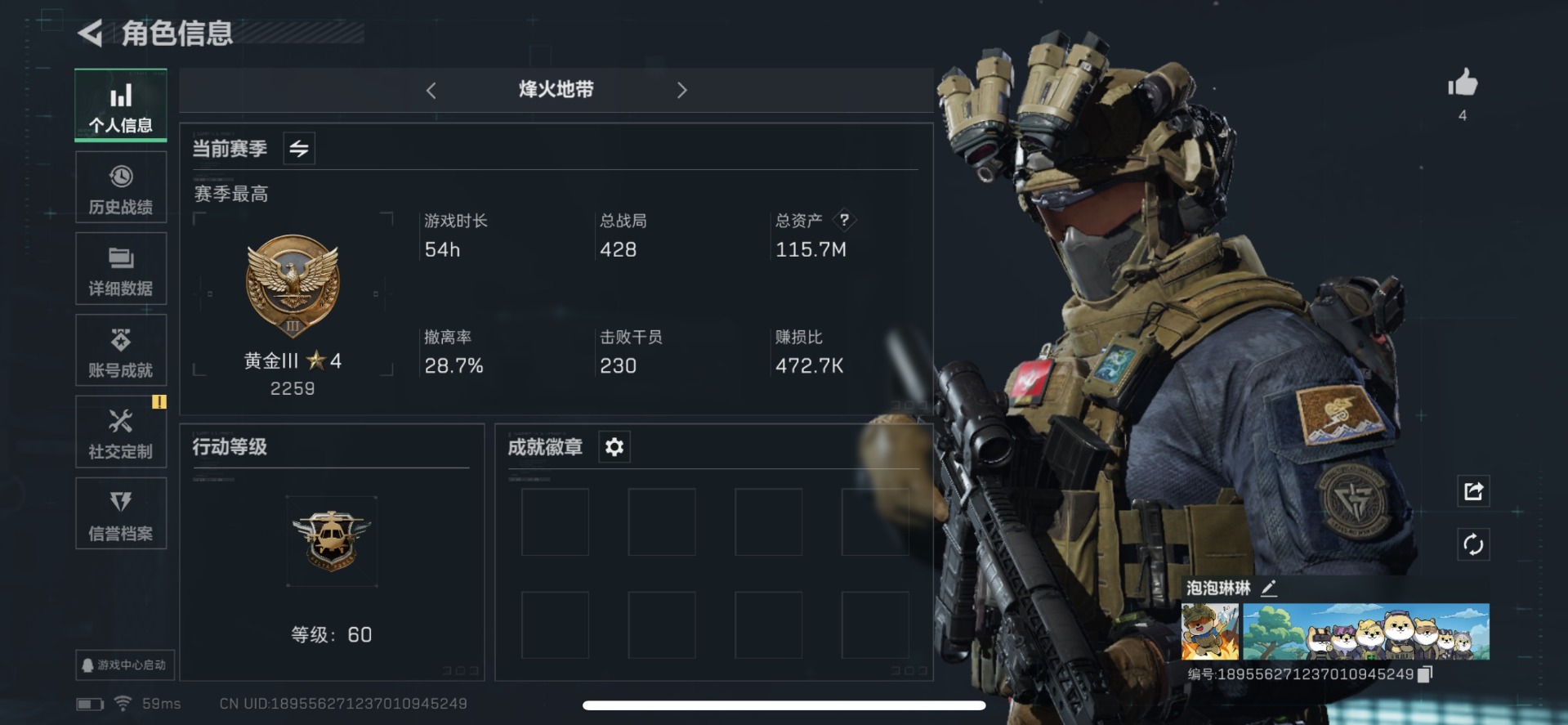 [12026089]总资产:115.7M 1干员外观 4传说枪械 哈夫币:86.399K 高级安全箱(2×3)9.15号到期 可二次 可修改实名 烽火地带段位:黄金 全面战场段位:无段位 传说武器皮肤:CAR-15突击步枪-阿米娅,复合弓-黑-天际线,勇士冲锋枪-能天使-午夜邮差,725双管霰弹枪-送葬人-无题密令 干员外观:蜂医-送葬人·无题密令(S5)