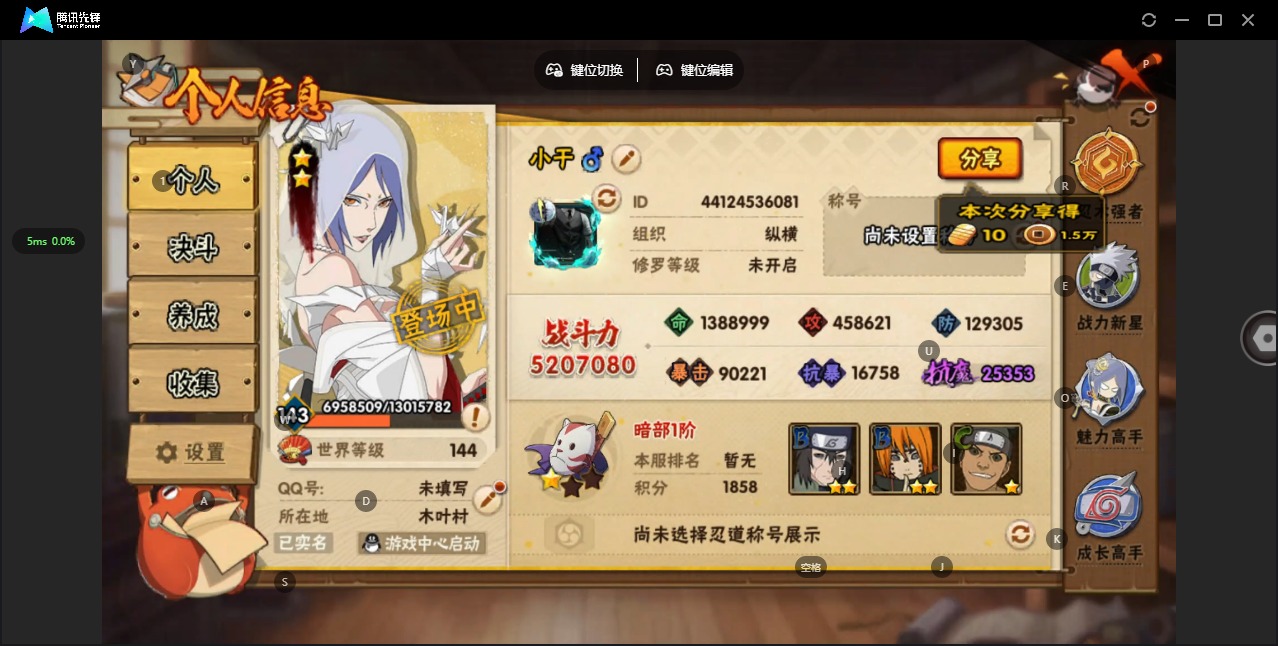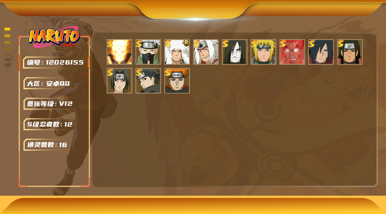 [12026155]V12 12S忍 36A忍 16通灵 520.7W战力 可二次 可修改实名 优质装备:熊猫,千手柱间「秽土转生」,迈特凯「死门」,漩涡鸣人 「九喇嘛连结」,宇智波斑「秽土转生·解」,宇智波止水「须佐能乎」,旗木卡卡西「须佐能乎」,自来也 「传说中的三忍」 S级忍者:自来也 「舞之豪杰」,宇智波鼬 「须佐能乎」,佩恩「天道」,波风水门,大蛇丸