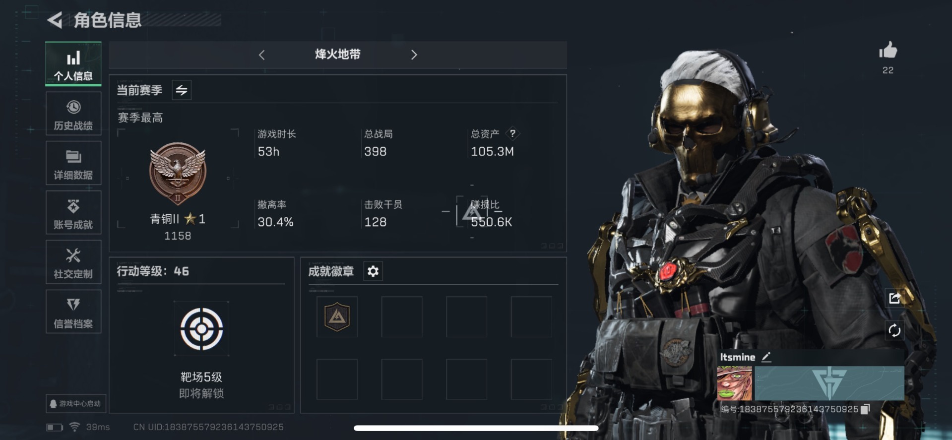 [12026360]总资产:105.3 1干员外观 1传说枪械 进阶安全箱(2×2)9.15号到期 可二次 可修改实名 烽火地带段位:青铜 全面战场段位:列兵 哈夫币:72.367 传说武器皮肤:复合弓-黑-天际线 干员外观:红狼-蚀金玫瑰