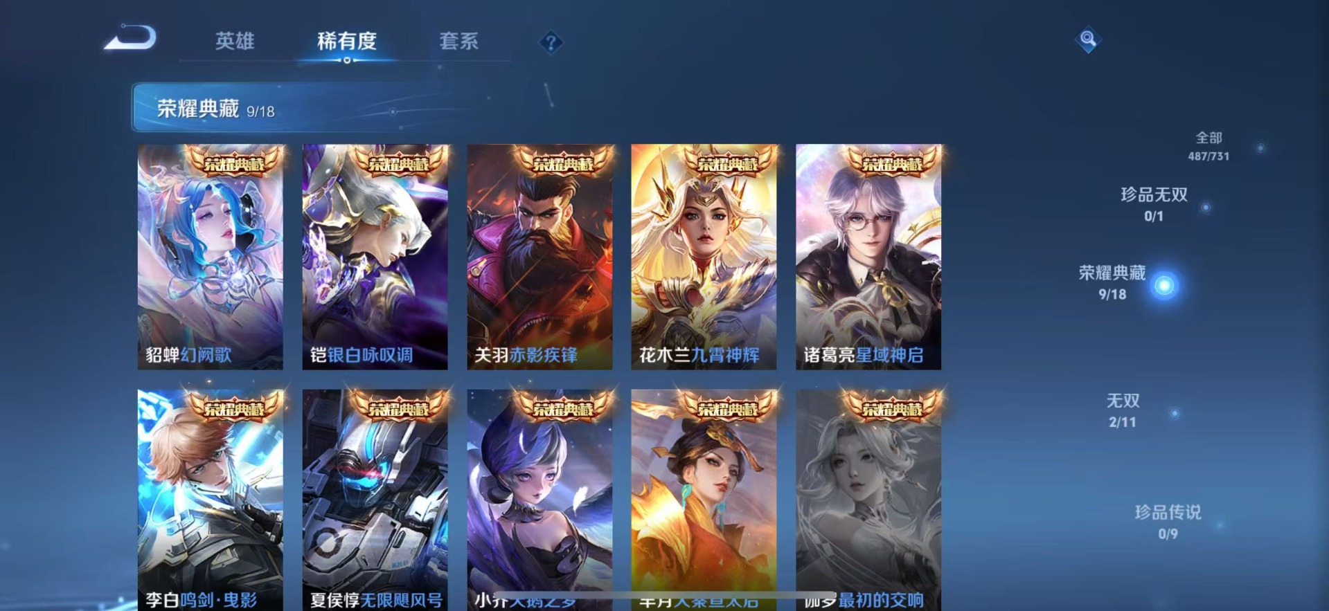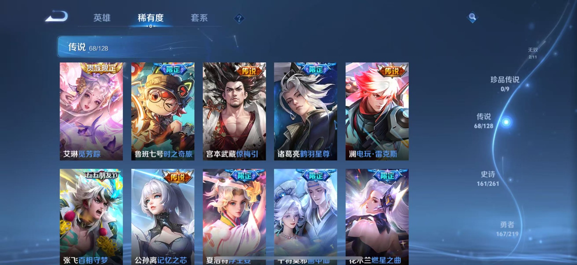 - PX_2104943-Q/至尊星耀/239皮肤/124英雄/2典藏/0珍品无双/0无双/2珍品传说/17传说/71史诗/8稀有英雄 【2 珍品传说】怪盗基德 马可波罗,时之奇旅 孙策, 【2 典藏皮肤】全息碎影 孙悟空,弑枪猎影 韩信, 【17 传说皮肤】启明星使 虞姬,李逍遥 曜,齐天大圣 孙悟空,燃星之曲 花木兰,鹤羽星尊 诸葛亮,时雨天司 诸葛亮,黄金射手座 后羿,时之奇旅 鲁班七号,时之