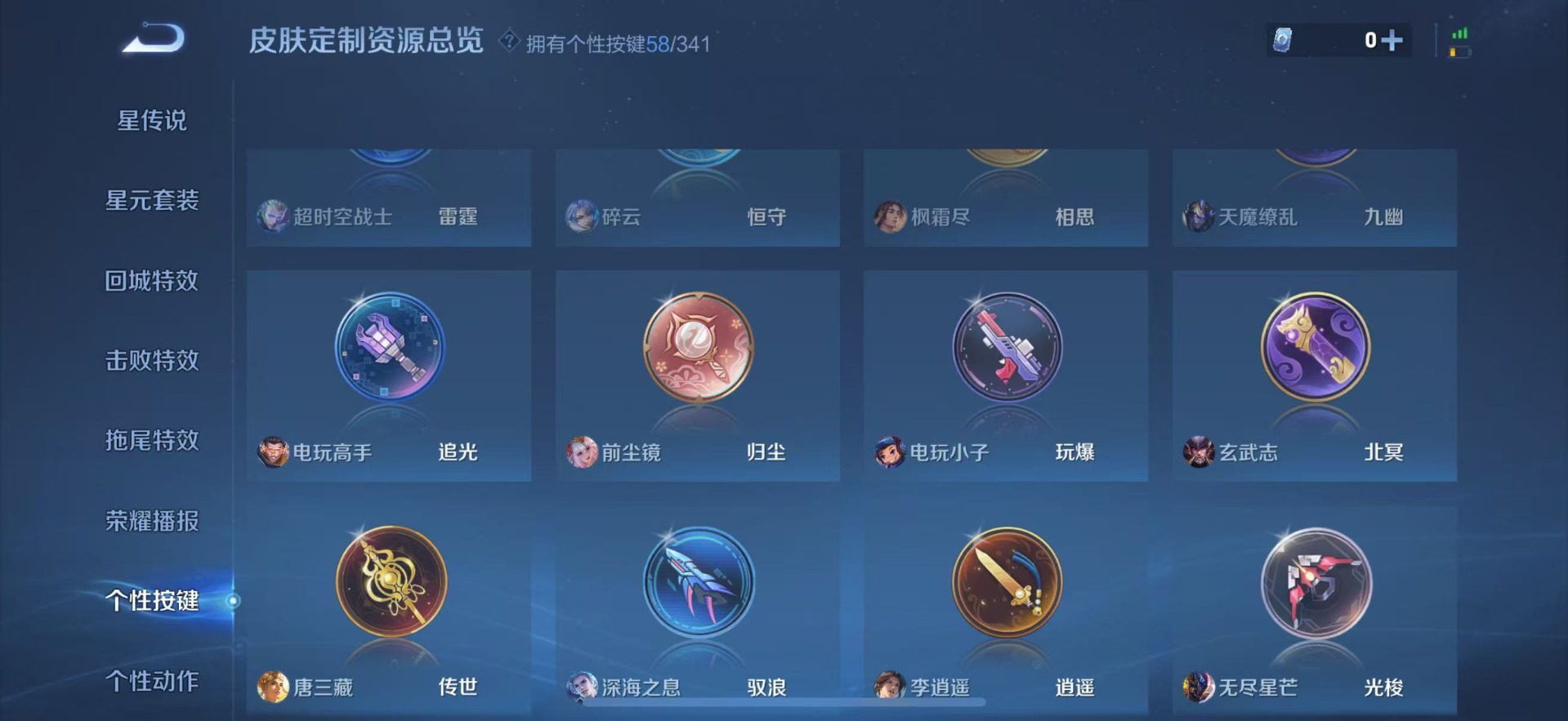 金蝉唐三藏,夏侯惇匿光决锋者,黄忠烈魂,老夫子圣诞老人,盾山梦圆繁星,铠青龙志,伽罗太华,苏烈玄武志,张飞虎魄,孙膑天狼运算者,典韦岱宗,孙尚香异界灵契,不知火舞绯月行,项羽霸王别姬,后羿无尽星芒,后羿如梦令,露娜启示之音,周瑜真爱至上,诸葛亮时雨天司,兰陵王默契交锋,公孙离玉兔公主,公孙离蜜橘之夏,裴擒虎梅西,貂蝉逐梦之音,鲁班大师匿光启智者,裴擒虎李小龙,裴擒虎天狼狩猎者,裴擒虎寅虎·赤拳,上官婉儿梁祝,上官婉儿神器·万象笔,上官婉儿天狼绘梦者,李白诗剑行,马可波罗山海·玄木吟,马可波罗深海之息,猪八戒猪悟能,女娲补天,孙悟空孙行者,孙悟空至尊宝,百里玄策白虎志,马超神威,雅典娜神奇女侠,赵云引擎之心,盘古冰霜神祇,云中君时之祈愿,妲己时之奇旅,韩信傲雪梅枪,韩信飞衡,韩信逐梦之影,百里守约朱雀志,墨子降魔,瑶山海·碧波行,娜可露露前尘镜,妲己热情桑巴,王昭君凤凰于飞,嫦娥如梦令,王昭君星穹之声,关羽冰锋战神,橘右京枫霜尽