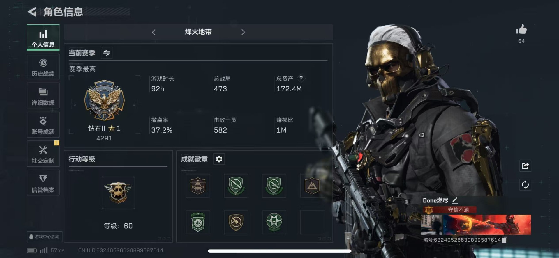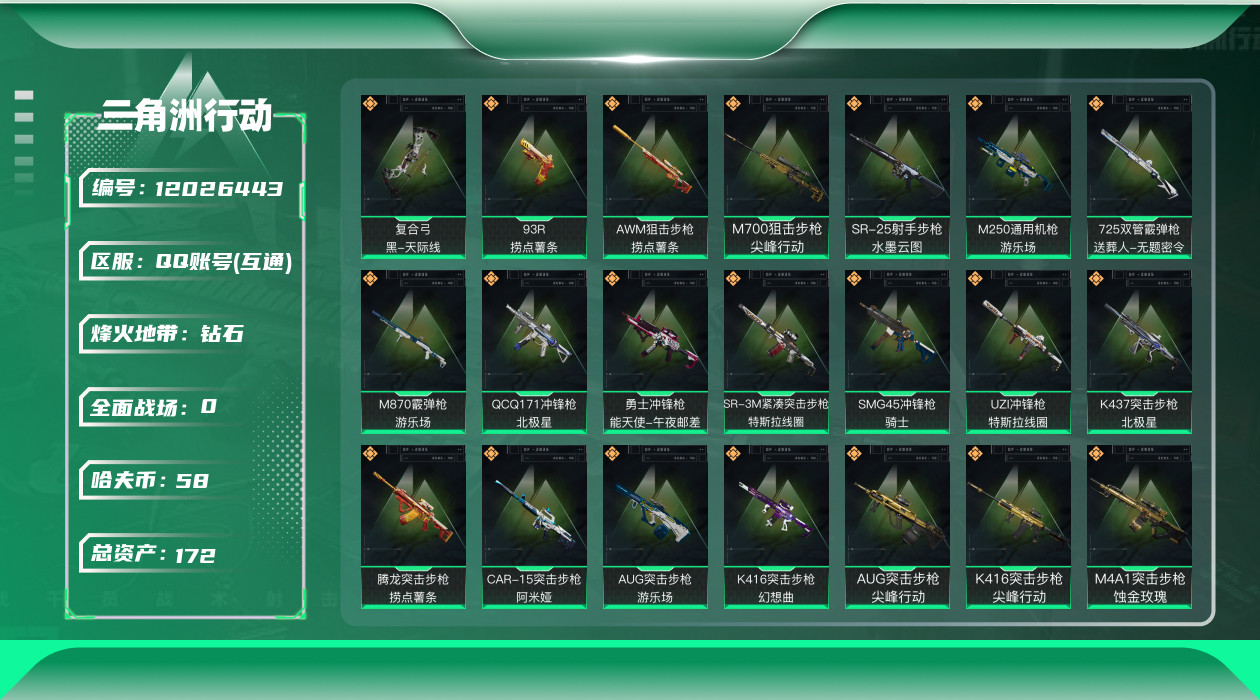 [12026443]总资产:172.4M 3干员外观 1近战传说 23传说枪械 哈夫币:58.616K 高级安全箱(9.17到期) 可二次 可修改实名 优质装备:近战-北极星 烽火地带段位:钻石 全面战场段位:无段位 传说武器皮肤:SR-25射手步枪-水墨云图,SMG45冲锋枪-骑士,93R-捞点薯条,AWM狙击步枪-捞点薯条,腾龙突击步枪-捞点薯条,CAR-15突击步枪-阿米娅,SR-3M紧凑突击步枪-特斯拉线圈,UZI冲锋枪-特斯拉线圈,勇士冲锋枪-能天使-午夜邮差,复合弓-黑-天际线,M4A1突击步枪-阿米娅,AUG突击步枪-游乐场,M250通用机枪-游乐场,K416突击步枪-幻想曲,725双管霰弹枪-送葬人-无题密令,K437突击步枪-北极星,QCQ171冲锋枪-北极星,M870霰弹枪-游乐场,M4A1突击步枪-蚀金玫瑰,M700狙击步枪-尖峰行动,AUG突击步枪-尖峰行动,K416突击步枪-尖峰行动 干员外观:红狼-蚀金玫瑰,骇爪-水墨云图,蜂医-送葬人·无题密令(S5)
