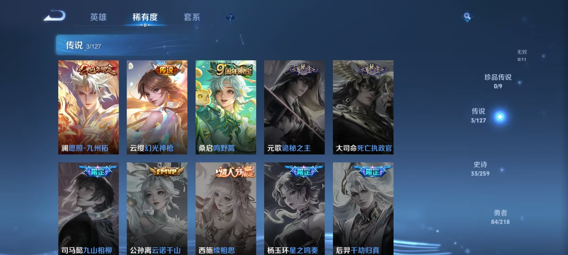 - [12141371]V7 14传说 123英雄 232皮肤 可修改实名 优质装备:黄金狮子座,云鹰飞将(小将军),炽阳神光,地狱之眼,超时空战士-狄仁杰,挚爱之约,无双飞将,山海·炽霜斩(李信年限),燃星之曲,浮生妄,涂山容容 传说皮:幻光神枪 珍宝阁皮:妄想食味 限定皮:愿照·山河定(司空震年限),影龙天霄,五谷丰年,冰锋战神,李小龙,孙行者,天魔缭乱,山海·玄木吟(马可年限) 史诗皮:鸭鸭历险记-刘禅,苍鳞隐世,器灵·浮梦炉,化蝶舞,灵蛊蚀心,龙之律动,藏狐·褐绒,茶境仙,琥珀纪元伽罗,蔬乡物语(鲁班七号),百相守梦-黄忠,织梦人,紫霞仙子,苍穹之光,千年之狐,江河有灵,真我赫兹(镜),蒙恬荣光圣徽,无限星赏官,青蛇,偶像歌手,电玩·爆裂旋风,末日机甲-吕布,猫狗日记-孙策,乱世虎臣,节奏热浪,修罗,摇滚巨星,水果甜心,星夜王子,德古拉伯爵,幽灵船长,鬼剑武藏,舞动绿茵,逐浪之夏,水晶猎龙者,金属风暴,原初追逐者,圣诞狂欢,圣诞恋歌,鹰眼统帅,魅力维加斯,黎明之约,天秀·音浪,无心,未来纪元-赵云