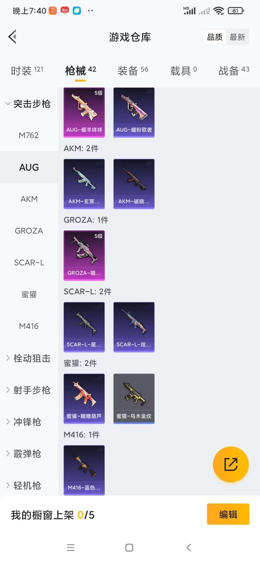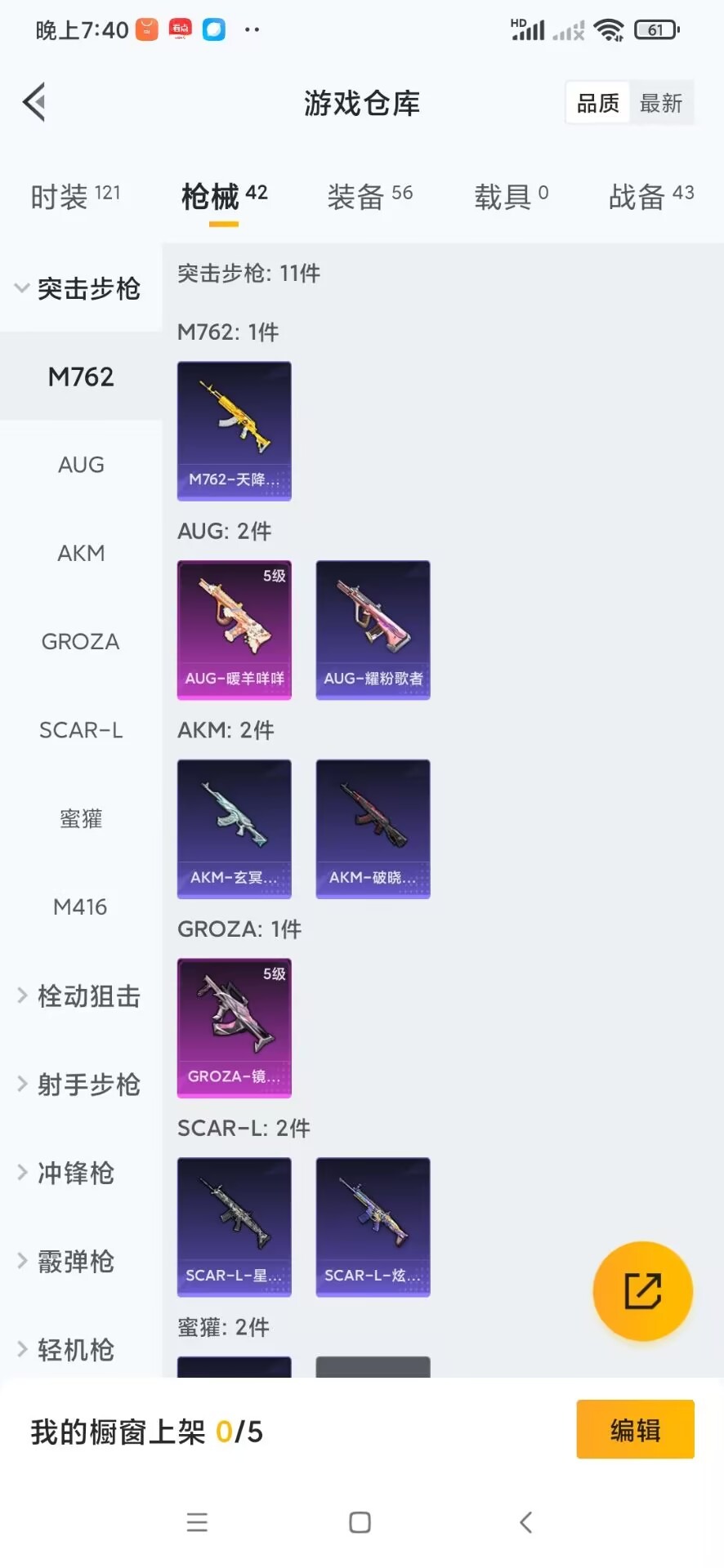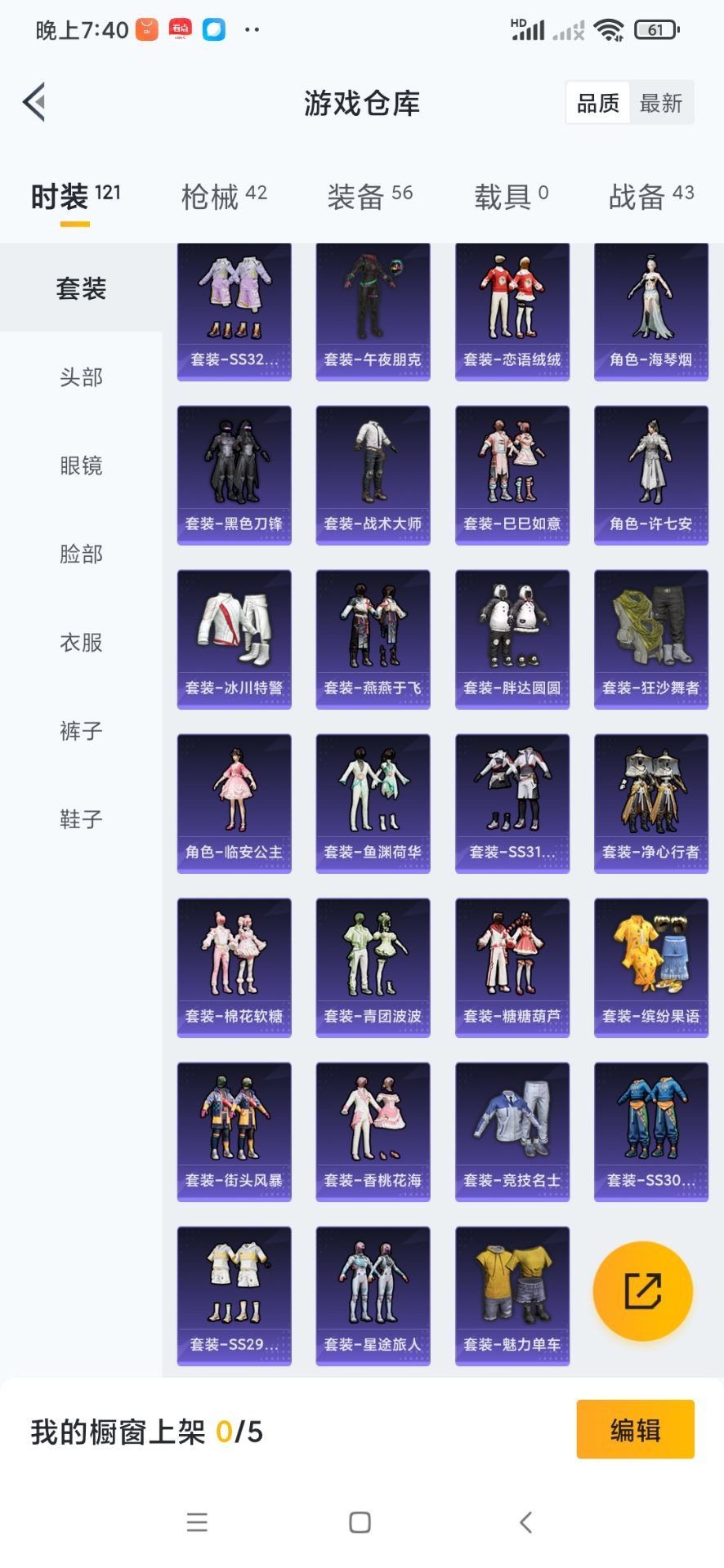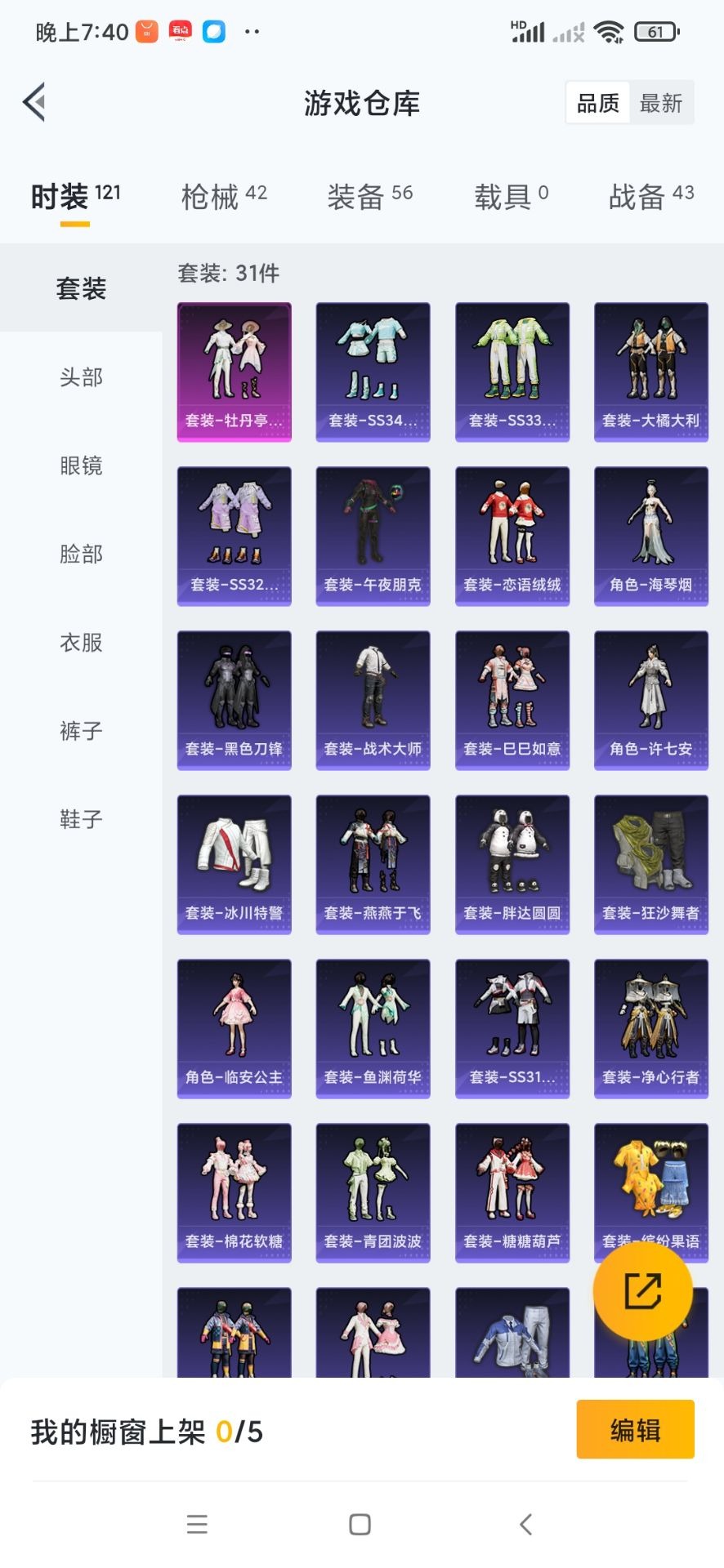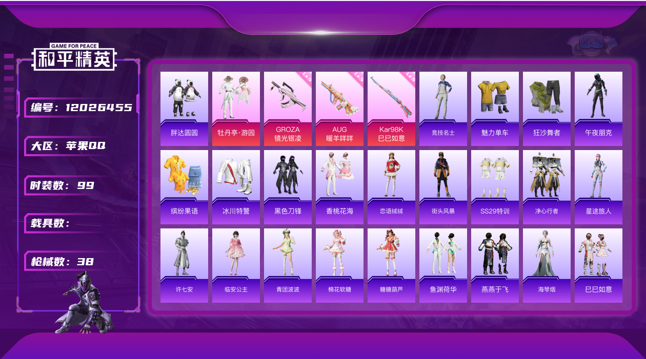 [12026455]1粉装 3特效枪 2印记 可二次 可修改实名 优质装备:牡丹亭·游园,GROZA-镜光银凌,AUG-暖羊咩咩,Kar98K-巳巳如意 热门装扮:胖达圆圆 五级特效枪:五级GROZA-镜光银凌,五级Kar98K-巳巳如意,五级AUG-暖羊咩咩 紫色装扮:SS30特训套装,SS31特训套装,SS33特训套装,午夜朋克,冰川特警,魅力单车,香桃花海,缤纷果语,狂沙舞者,SS29特训,星途旅人,鱼渊荷华,燕燕于飞,巳巳如意,海琴烟,青团波波,糖糖葫芦,棉花软糖,竞技名士,街头风暴,许七安,临安公主,净心行者,黑色刀锋,大橘大利,SS32特训服(SS32特训套装),恋语绒绒 优质战备:墨龙九天降落伞,星途旅人降落伞,牡丹亭·游园降落伞,脆鲨七海降落伞,临安公主降落伞