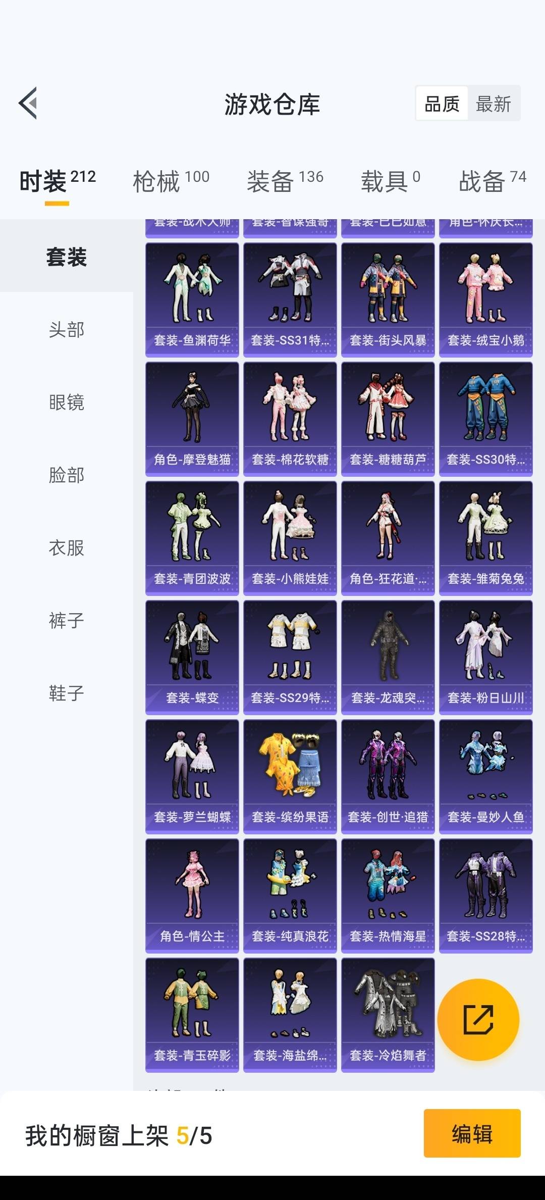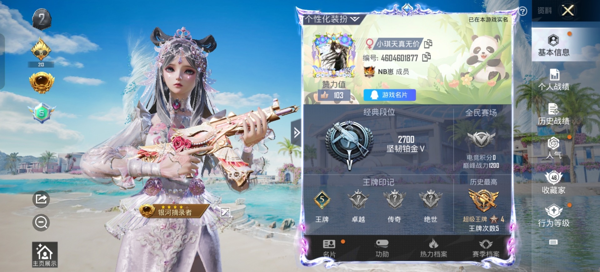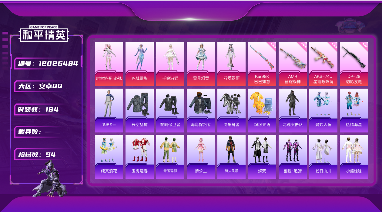 [12026484]5粉装 4特效枪 5印记 可二次 可修改实名 热门装扮:时空协奏·心弦,千金淑猫,雪月幻音,冷漠罗丽,冰域雷影 稀有枪皮:AMR-智耀战神,Kar98K-巳巳如意,AKS-74U-星穹咏叹调 五级特效枪:五级Kar98K-巳巳如意,五级AMR-智耀战神,五级AKS-74U-星穹咏叹调 一级特效枪:一级DP-28-豹影疾电 紫色装扮:SS30特训套装,霓虹热舞,SS31特训套装,云朵鹅,雪绒豹,SS33特训套装,缤纷果语,长空猛禽,龙魂突击队,蝶变,蓝海鲸歌,黎明保卫者,冷焰舞者,海岛探路者,粉日山川,小熊娃娃,雏菊兔兔,萝兰蝴蝶,SS29特训,纯真浪花,热情海星,曼妙人鱼,SS28特训,创世·追猎,狂花道·娜可露露,燕燕于飞,异域银装,鱼渊荷华,玉兔迎春,巳巳如意,海琴烟,青团波波,糖糖葫芦,棉花软糖,竞技名士,绒宝小鹅,摩登魅猫,街头风暴,怀庆长公主,情公主,大橘大利,粉恋花,蓝冰羽,紫幽梦,SS32特训服(SS32特训套装),青玉碎影,智谋强哥 优质战备:精灵梦叶罗丽降落伞,拳皇·狂花道降落伞,星途旅人降落伞,英伦信使降落伞,魔法神域降落伞,千金淑猫降落伞,时光之吻飞行器,幻彩电音降落伞,鬼刀降落伞,智耀战神降落伞,飞行器-天之羽翼
