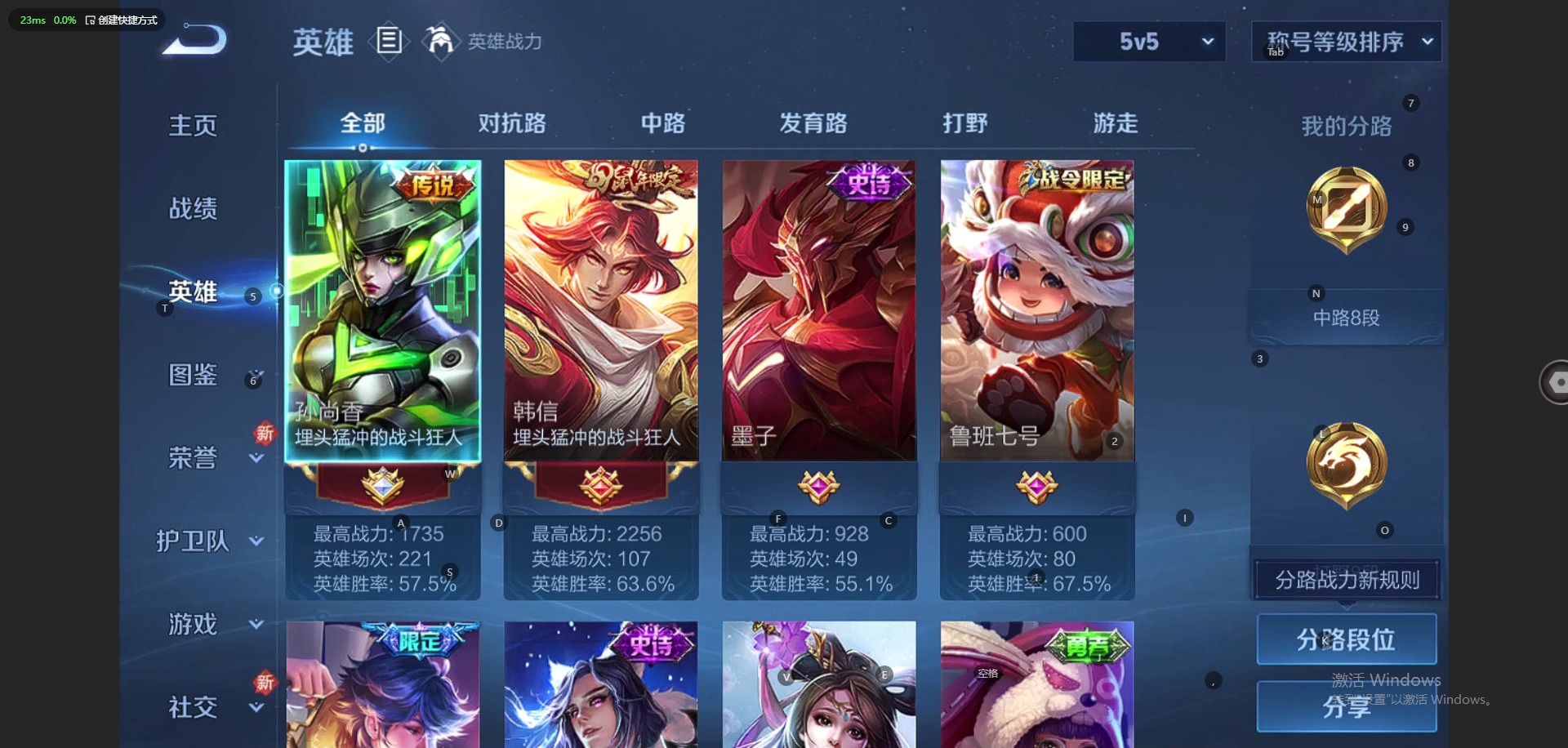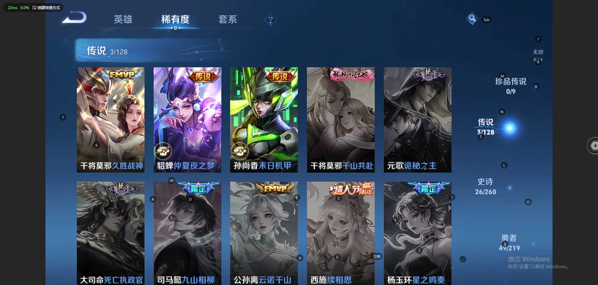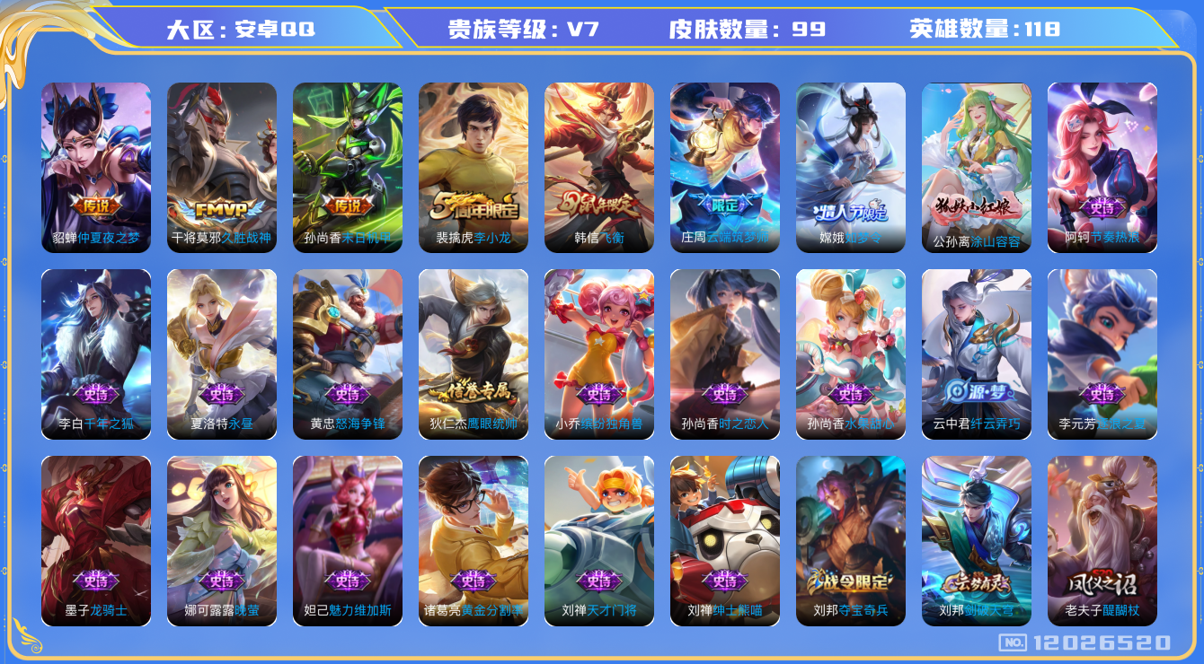 [12026520]V7 3传说 118英雄 99皮肤 可修改实名 优质装备:久胜战神,末日机甲-孙尚香(绿蚂蚱),仲夏夜之梦(大飞蛾),涂山容容 限定皮:飞衡(韩信年限),李小龙,如梦令-嫦娥,云端筑梦师 史诗皮:怒海争锋,黄金分割率,千年之狐,永昼,晚萤,龙骑士(小龙虾),时之恋人-孙尚香,节奏热浪,水果甜心,绅士熊喵,天才门将,纤云弄巧,缤纷独角兽,逐浪之夏,鹰眼统帅,魅力维加斯