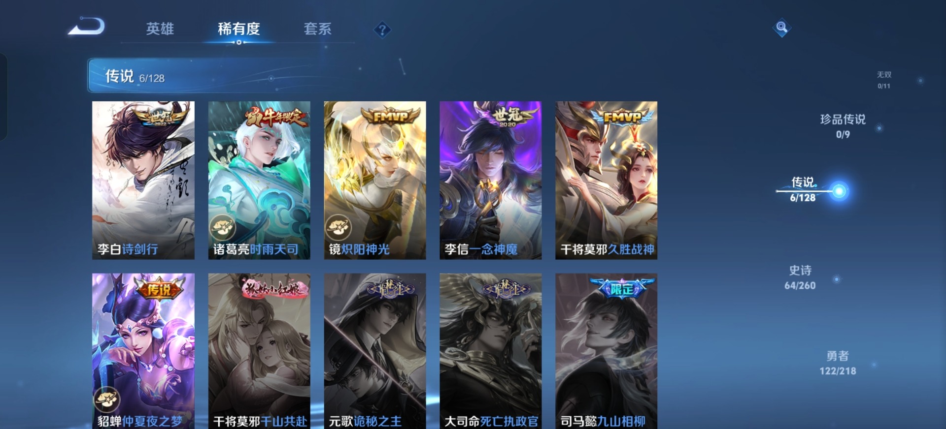 - [11875686]V7 4传说 124英雄 249皮肤 可修改实名 优质装备:黄金狮子座,冠军飞将,时之恋人-刘备(电焊工) 珍宝阁皮:优雅恋人,蔷薇恋人,女武神 限定皮:白虎志(电光耗子),梅西,飞衡(韩信年限),遇见飞天,高山流水,五谷丰年,游园惊梦,梁祝,李小龙,逐梦之影,默契交锋-花木兰,大圣娶亲,美猴王 史诗皮:紫霞仙子,千年之狐,江河有灵,冰冠公主,偶像歌手,乱世虎臣,节奏热浪,摇滚巨星,水果甜心,天才门将,星夜王子,心灵骇客,功夫厨神,德古拉伯爵,暗隐猎兽者,幽灵船长,鬼剑武藏,舞动绿茵,繁星吟游(呼啦呼啦),拒霜思,缤纷独角兽,乘风破浪,逐浪之夏,水晶猎龙者,曙光守护者,金属风暴,原初追逐者,圣诞狂欢,圣诞恋歌,鹰眼统帅,魅力维加斯,黎明之约,未来纪元-赵云