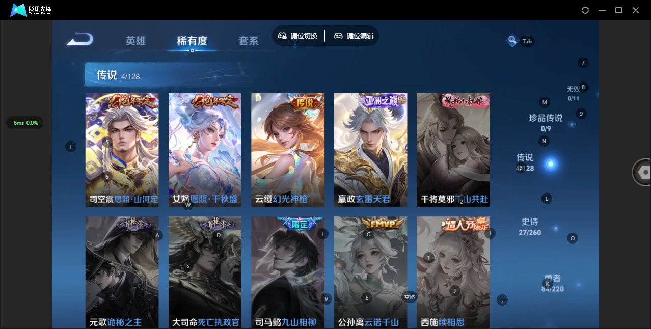 [12026838]V6 4传说 123英雄 145皮肤 可修改实名 优质装备:玄雷天君 传说皮:幻光神枪 限定皮:愿照·山河定(司空震年限),愿照·千秋盛(女娲年限),遇见飞天,梁祝,逐梦之光,美猴王 史诗皮:器灵·浮梦炉,化蝶舞,龙之律动,苍穹之光,白龙吟,千年之狐,电玩·爆裂旋风,暗夜猫娘,女仆咖啡,摇滚巨星,水果甜心,功夫厨神,鬼剑武藏,缤纷独角兽,水晶猎龙者,金属风暴,圣诞狂欢,圣诞恋歌,鹰眼统帅,魅力维加斯,奇遇舞章