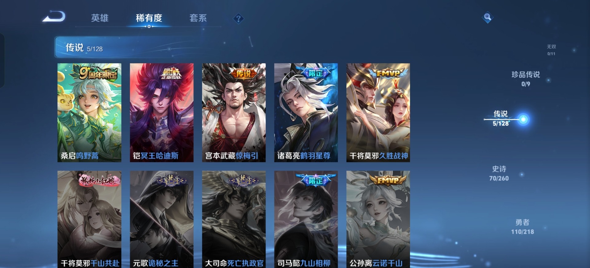 - [11601103]V8 1典藏 1珍品传说 10传说 126英雄 308皮肤 典藏英雄武则天 可修改实名 优质装备:倪克斯神谕(宇宙婆娘),怪盗基德,炽阳神光,地狱火,仲夏夜之梦(大飞蛾),地狱之眼 传说皮:吕布曦玄引,幻光神枪 珍宝阁皮:妄想食味,优雅恋人 限定皮:愿照·九州拓(澜年限),鸣野蒿,至尊宝,凤求凰(白切鸡),凤凰于飞,飞衡(韩信年限),遇见飞天,游园惊梦,梁祝,御风骁将(吕布年限),李小龙,辉光之辰,霸王别姬-项羽,霸王别姬-虞姬,默契交锋-花木兰,孙行者,梦圆繁星 史诗皮:鸭鸭历险记-刘禅,器灵·浮梦炉,化蝶舞,星界战将,灵蛊蚀心,龙之律动,破空之剑,战舞者,遇见神鹿,紫霞仙子,电玩小子(小书包),白龙吟,黄金分割率,特工魅影,千年之狐,江河有灵,百解令(蒙犽),偶像歌手,龙骑士(小龙虾),魅语,冰冠公主,末日机甲-吕布,乱世虎臣,节奏热浪,女仆咖啡,摇滚巨星,水果甜心,绅士熊喵,天才门将,星夜王子,德古拉伯爵,暗隐猎兽者,幽灵船长,鬼剑武藏,心灵战警,乐园奇幻夜,舞动绿茵,地狱岩魂,纤云弄巧,繁星吟游(呼啦呼啦),缤纷独角兽,乘风破浪,逐浪之夏,水晶猎龙者,箭羽风息,金属风暴,原初追逐者,圣诞狂欢,圣诞恋歌,鹰眼统帅,王者之锤,魅力维加斯,黎明之约,未来纪元-赵云