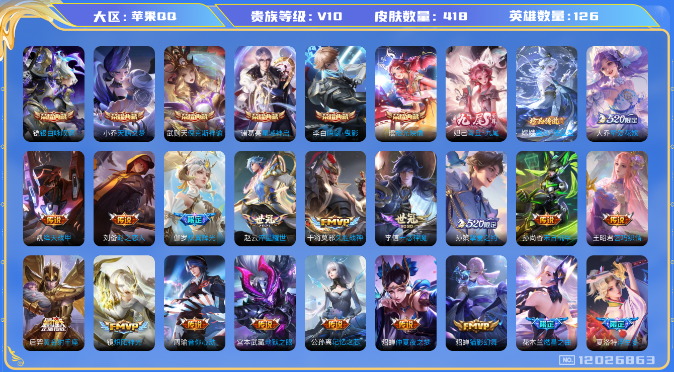 [12026863]V10 6典藏 1无双 1珍品传说 40传说 126英雄 418皮肤 典藏英雄武则天 可修改实名 优质装备:天鹅之梦(小乔典藏),倪克斯神谕(宇宙婆娘),鸣剑·曳影,星域神启(倪克斯贼亮),银白咏叹调(倪克斯侍卫),青丘·九尾(妲己无双),拾光映像(瑶典藏),器灵·落星盏,黄金射手座,冠军飞将,云鹰飞将(小将军),绛天战甲(鸡嘴战神),猫影幻舞,久胜战神,炽阳神光,一念神魔,云霓雀翎,末日机甲-孙尚香(绿蚂蚱),仲夏夜之梦(大飞蛾),地狱之眼,音你心动-周瑜,胖达荣荣,李逍遥,乞巧织情,时之恋人-刘备(电焊工),游龙清影(小青龙),淬星耀世,超时空战士-狄仁杰,挚爱之约,挚爱花嫁,无双飞将,碎云,神器·狴犴令,炽翼辉光(娃娃菜牛角包),燃星之曲,浮生妄,记忆之芯(机甲兔),青丘·九尾,艾琳觅芳踪,涂山容容 传说皮:幻光神枪 珍宝阁皮:万物之道,优雅恋人,玩趣恶龙 限定皮:愿照·千秋盛(女娲年限),鸣野蒿,至尊宝,凤求凰(白切鸡),太华(伽罗年限),傲雪梅枪,星穹之声,白晶晶,诗剑行,匿光决锋者,怒海麟威,降魔,五谷丰年,青龙志(铠年限),天狼绘梦者,李小龙,玄武志(苏烈年限),朱雀志(守约年限),如梦令-后羿,大圣娶亲,匿光追影者,玉兔公主,启示之音,神器·万象笔,山海·玄木吟(马可年限) 史诗皮:灵蛊蚀心,星界战将,龙之律动,石田雨龙,茶境仙,破空之剑,百相守梦-百里守约,百相守梦-黄忠,遇见神鹿,紫霞仙子,苍穹之光,电玩小子(小书包),白龙吟,黄金分割率,特工魅影,千年之狐,永昼,江河有灵,魅语,百解令(蒙犽),高渐离燃音魔法,蒙恬荣光圣徽,无限星赏官,冰冠公主,青蛇,偶像歌手,白蛇,晚萤,电玩·爆裂旋风,暗夜猫娘,龙骑士(小龙虾),末日机甲-吕布,猫狗日记-孙策,猫狗日记-大乔,时之恋人-孙尚香,乱世虎臣,节奏热浪,修罗,女仆咖啡,摇滚巨星,水果甜心,绅士熊喵,天才门将,星夜王子,心灵骇客,时之奇旅-安琪拉,功夫厨神,德古拉伯爵,暗隐猎兽者,幽灵船长,鬼剑武藏,暗渊魔法,心灵战警,乐园奇幻夜,天秀·启明,舞动绿茵,地狱岩魂,诗语江南,纤云弄巧,繁星吟游(呼啦呼啦),拒霜思,缤纷独角兽,乘风破浪,逐浪之夏,龙鼓争鸣,月团寄思,水晶猎龙者,曙光守护者,热力回旋,箭羽风息,金属风暴,原初追逐者,圣诞狂欢,圣诞恋歌,鹰眼统帅,暗夜贵公子,魅力维加斯,黎明之约,雪