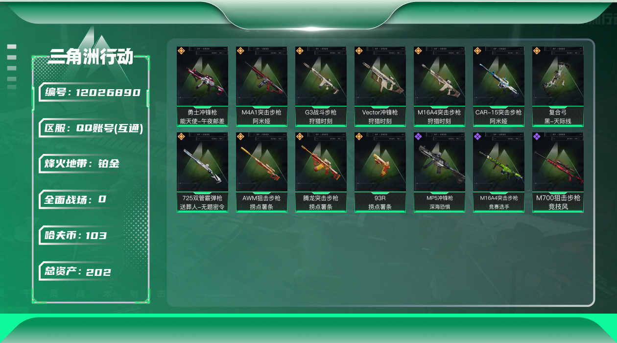 [12026890]总资产:202.8M 11传说枪械 哈夫币:103K 高级安全箱(2×3)9.15号到期 可二次 可修改实名 烽火地带段位:铂金 全面战场段位:校官 传说武器皮肤:93R-捞点薯条,Vector冲锋枪-狩猎时刻,G3战斗步枪-狩猎时刻,M16A4突击步枪-狩猎时刻,AWM狙击步枪-捞点薯条,腾龙突击步枪-捞点薯条,CAR-15突击步枪-阿米娅,勇士冲锋枪-能天使-午夜邮差,复合弓-黑-天际线,M4A1突击步枪-阿米娅,725双管霰弹枪-送葬人-无题密令 史诗武器皮肤:M16A4突击步枪-竞赛选手,MP5冲锋枪-深海恐惧,M700狙击步枪-竞技风