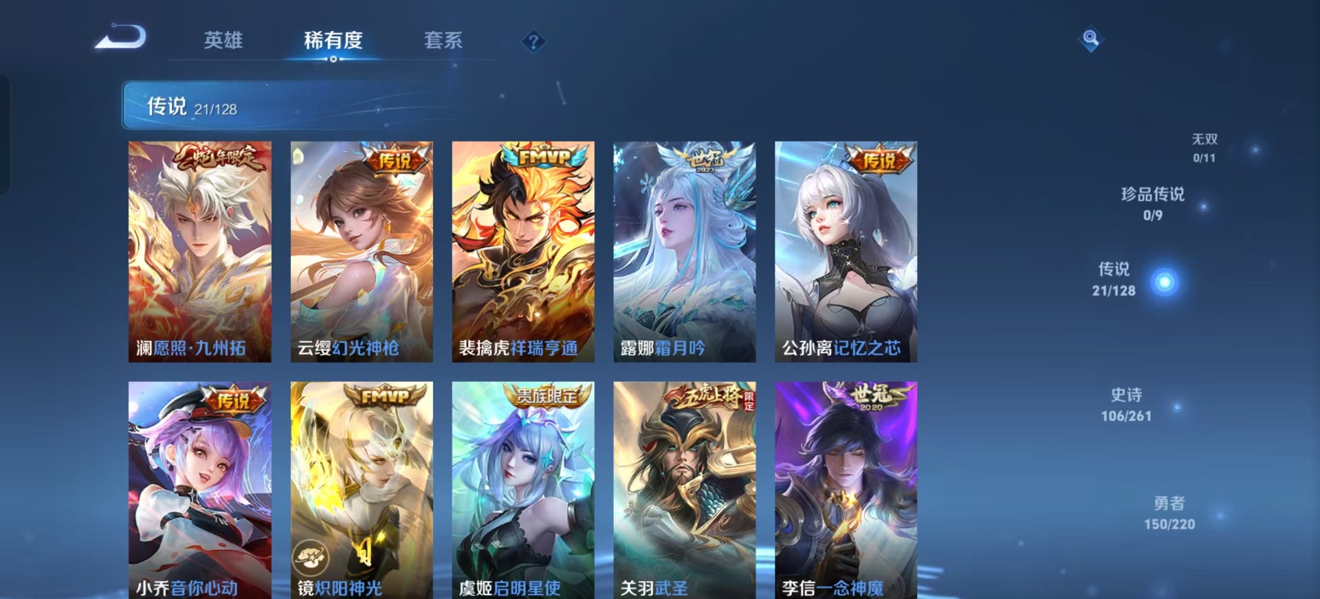 曹操天狼征服者,干将莫邪冰霜恋舞曲,典韦岱宗,后羿辉光之辰,公孙离蜜橘之夏,裴擒虎李小龙,上官婉儿梁祝,安琪拉魔法小厨娘,马可波罗逐梦之星,马可波罗山海·玄木吟,孙悟空至尊宝,马超神威,雅典娜神奇女侠,赵云引擎之心,韩信飞衡,百里守约朱雀志,澜愿照·九州拓,关羽武圣