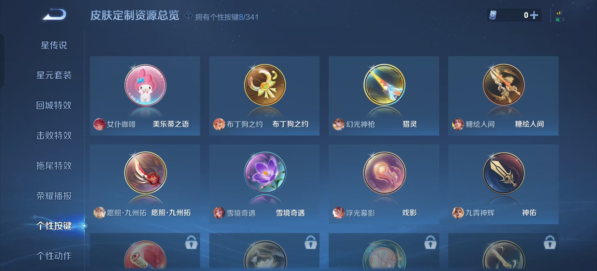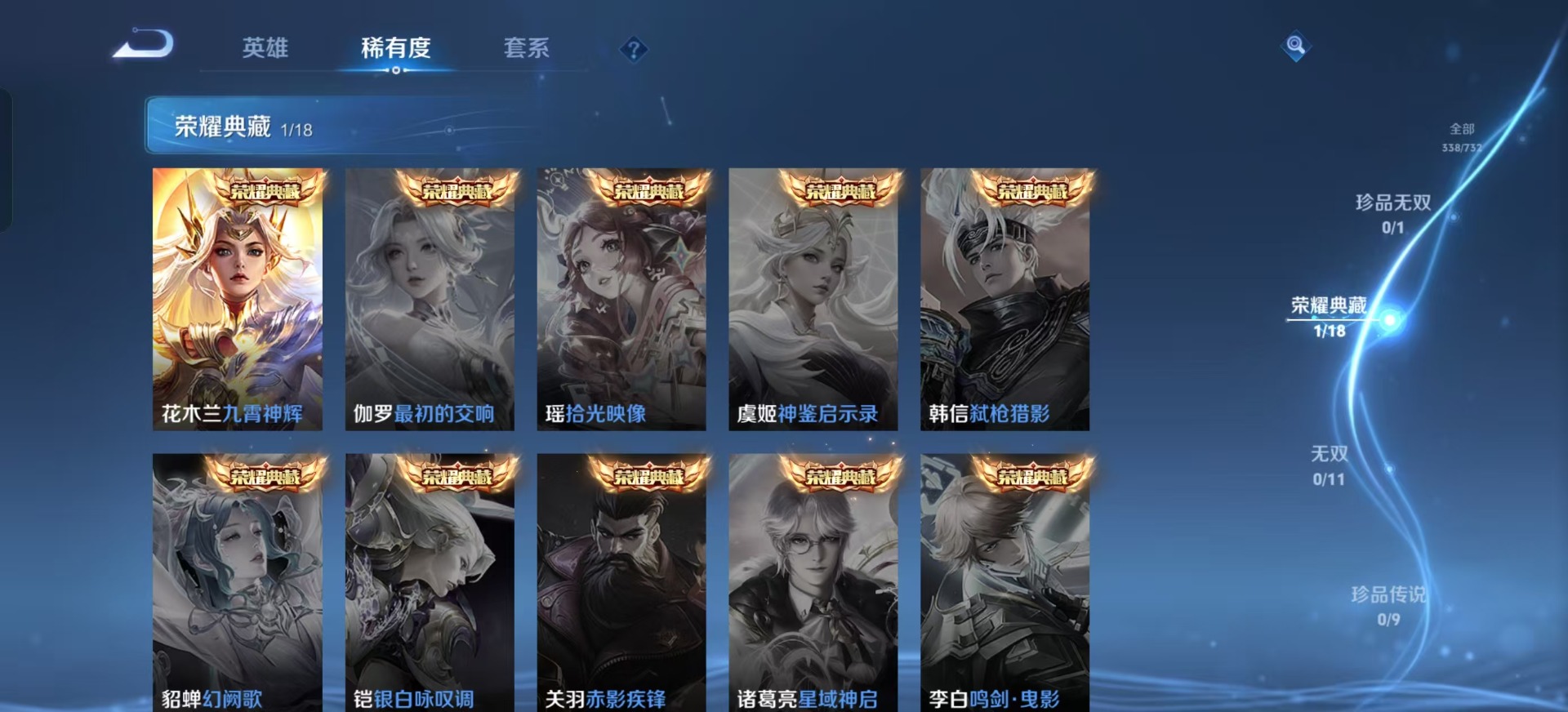 刘备时之恋人,干将莫邪久胜战神,小乔音你心动,李信一念神魔,露娜霜月吟,镜炽阳神光,公孙离记忆之芯,裴擒虎祥瑞亨通,貂蝉猫影幻舞,云缨幻光神枪