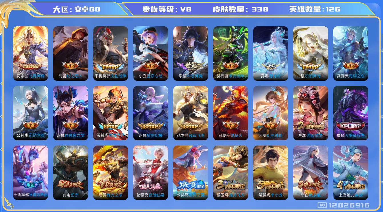 [12026916]V8 1典藏 21传说 126英雄 338皮肤 典藏英雄武则天 可修改实名 优质装备:九霄神辉(木兰典藏),冠军飞将,猫影幻舞,久胜战神,炽阳神光,一念神魔,末日机甲-孙尚香(绿蚂蚱),地狱火,仲夏夜之梦(大飞蛾),音你心动-小乔,海洋之心,时之恋人-刘备(电焊工),记忆之芯(机甲兔),霜月吟 传说皮:祥瑞亨通,幻光神枪 珍宝阁皮:蔷薇恋人 限定皮:愿照·九州拓(澜年限),至尊宝,凤求凰(白切鸡),武陵仙君(小桃花),魔法小厨娘,神威(电光马子),飞衡(韩信年限),遇见飞天,五谷丰年,武圣,游园惊梦,梁祝,逐梦之星,岱宗(典韦年限),天狼征服者,李小龙,朱雀志(守约年限),永曜之星,辉光之辰,引擎之心,冰霜恋舞曲,蜜橘之夏,神奇女侠,山海·玄木吟(马可年限) 史诗皮:鸭鸭历险记-刘禅,糖绘人间,化蝶舞,星界战将,龙之律动,石田雨龙,茶境仙,怒海争锋,东方月初,蒙犽顽岩魄,芈月浮光幕影,蔬乡物语(鲁班七号),超元猎域,百相守梦-百里守约,百相守梦-黄忠,紫霞仙子,苍穹之光,电玩小子(小书包),黄金分割率,特工魅影,千年之狐,永昼,江河有灵,魅语,高渐离燃音魔法,冰冠公主,偶像歌手,晚萤,暗夜猫娘,猫狗日记-孙策,时之恋人-孙尚香,乱世虎臣,节奏热浪,修罗,女仆咖啡,摇滚巨星,水果甜心,绅士熊喵,天才门将,星夜王子,心灵骇客,功夫厨神,德古拉伯爵,暗隐猎兽者,幽灵船长,鬼剑武藏,心灵战警,天秀·启明,舞动绿茵,地狱岩魂,纤云弄巧,繁星吟游(呼啦呼啦),缤纷独角兽,乘风破浪,逐浪之夏,水晶猎龙者,曙光守护者,箭羽风息,金属风暴,原初追逐者,圣诞狂欢,圣诞恋歌,鹰眼统帅,暗夜贵公子,魅力维加斯,黎明之约,雪上飞焰,奇遇舞章,无心,未来纪元-赵云
