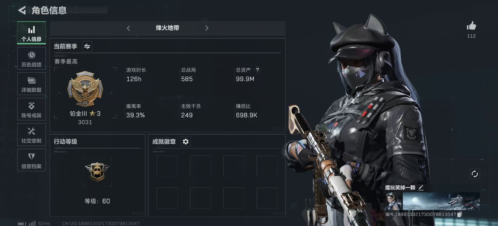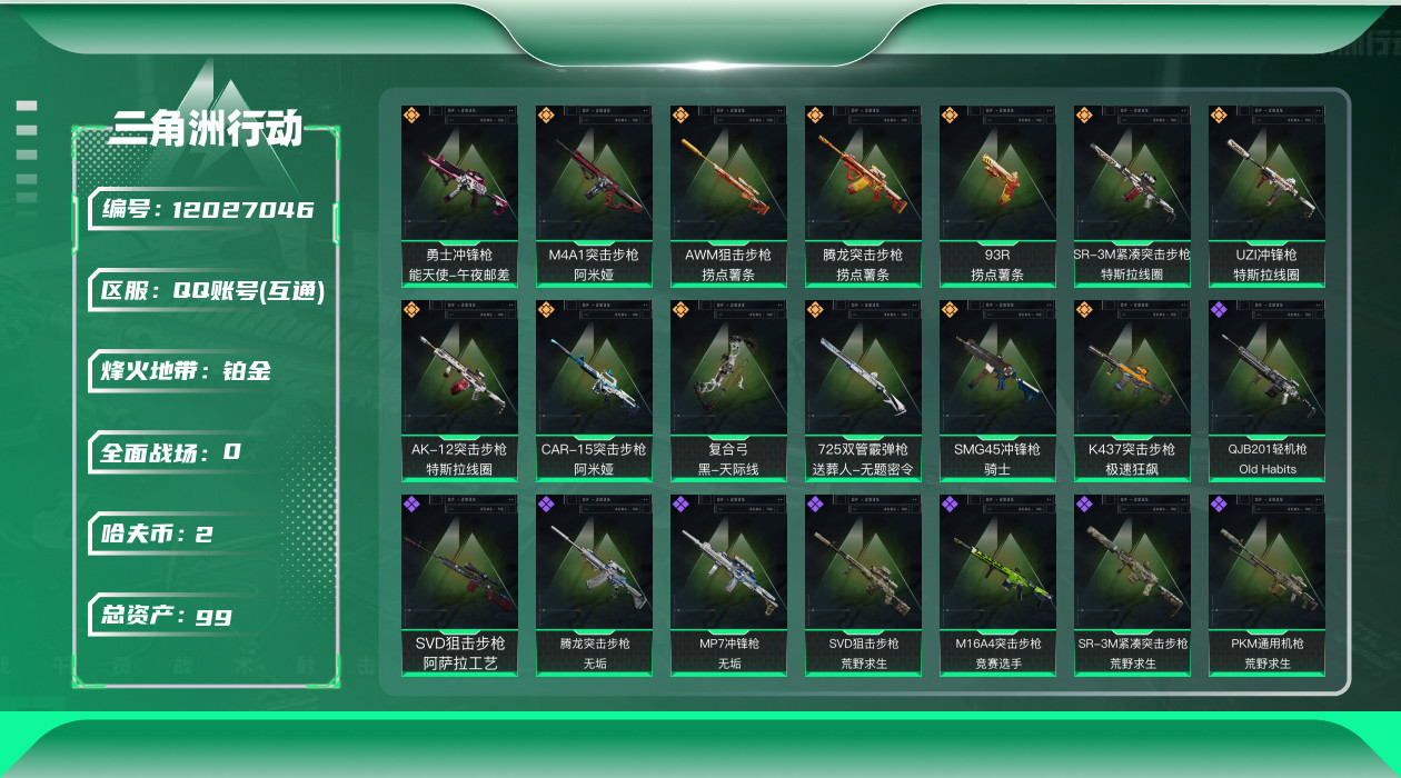 [12027046]总资产:99.9M 13传说枪械 哈夫币:2.256K 顶级安全箱(3×3)9.15号到期 可二次 可修改实名 优质装备:顶级安全箱(3x3) 烽火地带段位:铂金 全面战场段位:校官 传说武器皮肤:K437突击步枪-极速狂飙,SMG45冲锋枪-骑士,UZI冲锋枪-特斯拉线圈,AWM狙击步枪-捞点薯条,腾龙突击步枪-捞点薯条,93R-捞点薯条,AK-12突击步枪-特斯拉线圈,SR-3M紧凑突击步枪-特斯拉线圈,勇士冲锋枪-能天使-午夜邮差,复合弓-黑-天际线,725双管霰弹枪-送葬人-无题密令,M4A1突击步枪-阿米娅,CAR-15突击步枪-阿米娅 史诗武器皮肤:M16A4突击步枪-竞赛选手,QJB201轻机枪-Old Habits,SV-98狙击步枪-林中猎手,PKM通用机枪-荒野求生,SCAR-H战斗步枪-囚徒,腾龙突击步枪-无垢,MP7冲锋枪-无垢,PSG-1射手步枪-无垢,SVD狙击步枪-荒野求生,SR-3M紧凑突击步枪-荒野求生,SVD狙击步枪-阿萨拉工艺