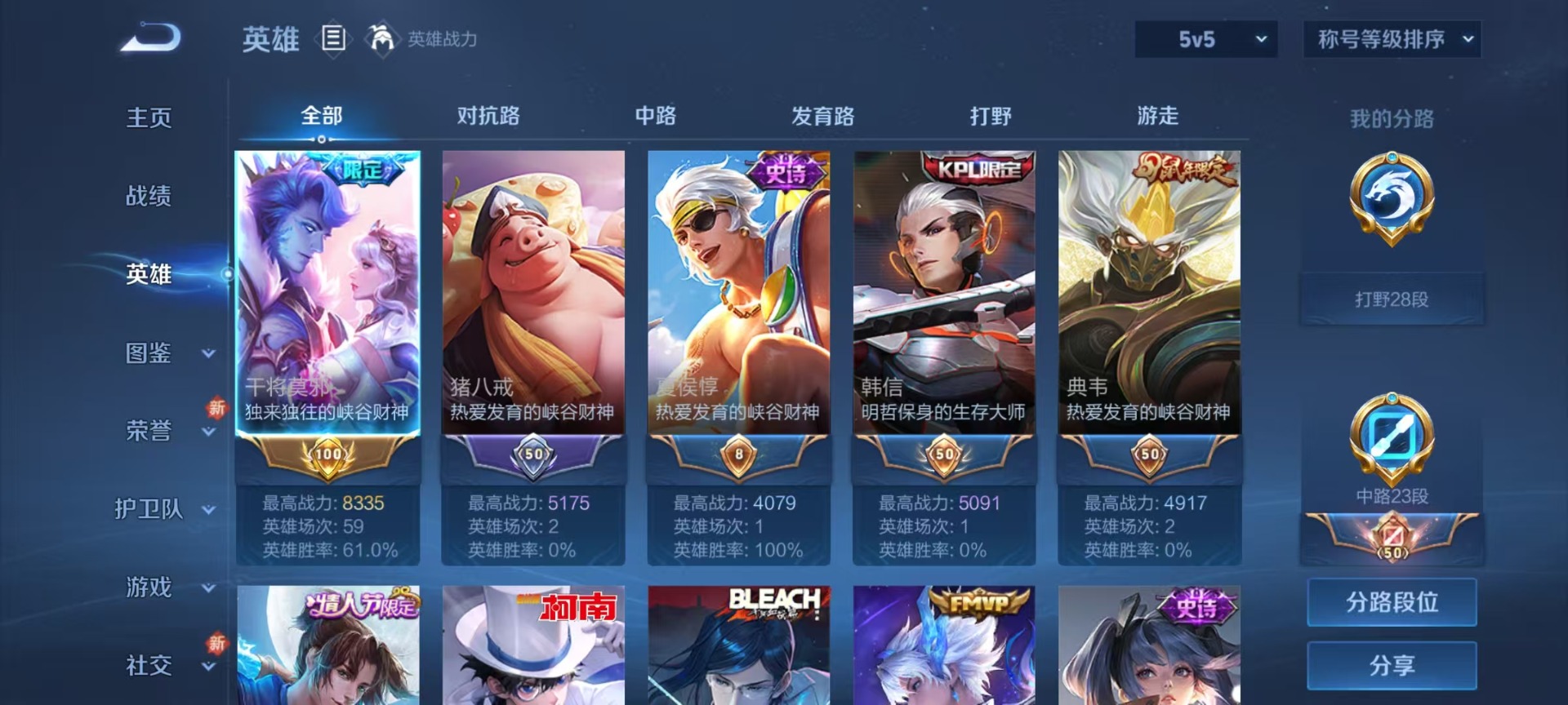 - [11471480]V6 1典藏 2珍品传说 1传说 110英雄 99皮肤 可修改实名 女号 优质装备:全息碎影(猴子典藏),朽木白哉,黑崎一护,地狱火 珍宝阁皮:玩趣恶龙 限定皮:游园惊梦,李小龙,大圣娶亲 史诗皮:龙之律动,石田雨龙,百相守梦-周瑜,百相守梦-黄忠,江河有灵,时之恋人-孙尚香,水果甜心,星夜王子,功夫厨神,幽灵船长,鬼剑武藏,拒霜思,缤纷独角兽,乘风破浪,逐浪之夏,曙光守护者,原初追逐者,圣诞狂欢,鹰眼统帅,未来纪元-赵云
