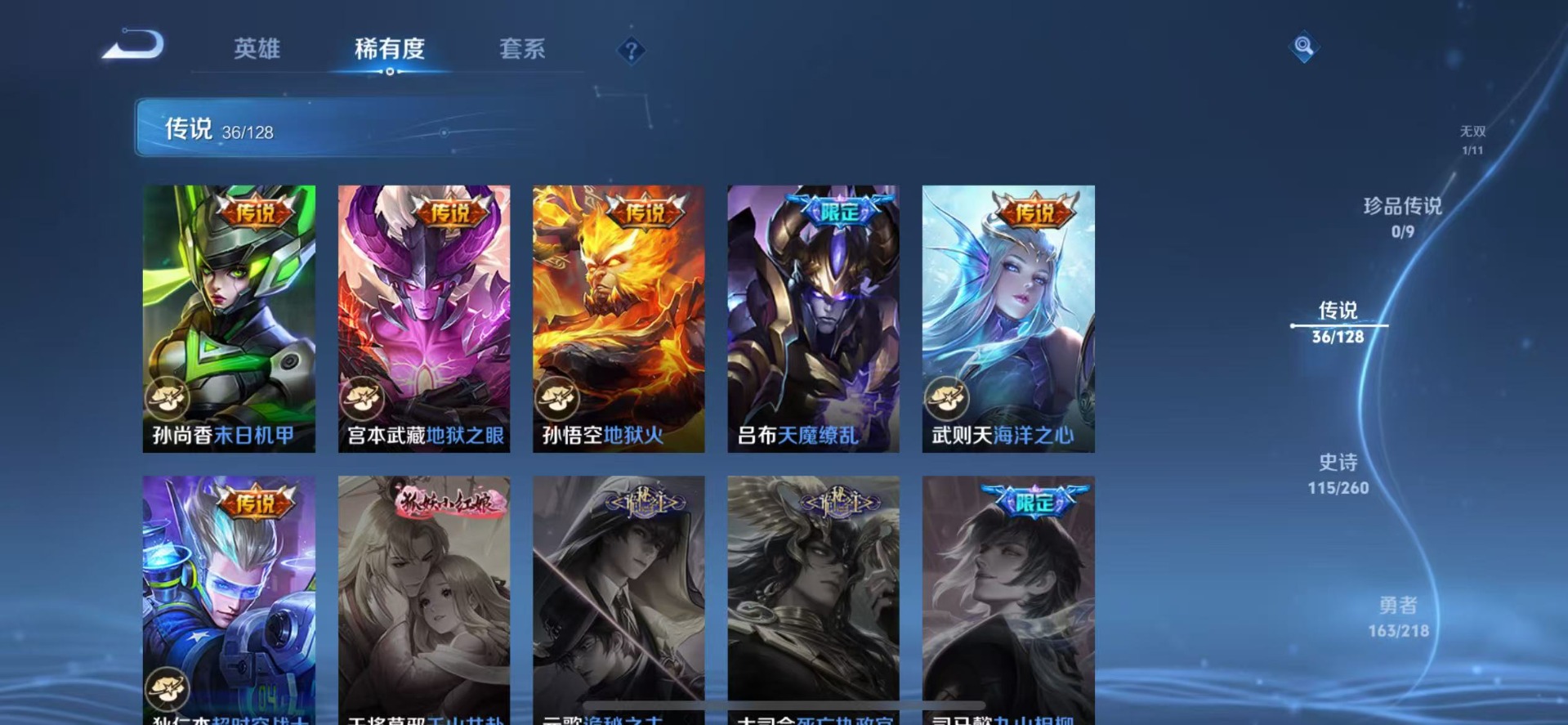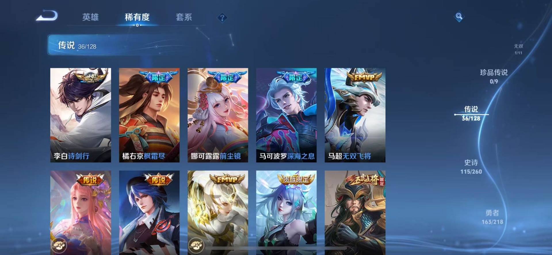 赵云百木心枪,干将莫邪冰霜恋舞曲,露娜一生所爱,镜匿光追影者,庄周云端筑梦师,公孙离蜜橘之夏,裴擒虎李小龙,上官婉儿梁祝,上官婉儿天狼绘梦者,李白诗剑行,马可波罗深海之息,桑启鸣野蒿,猪八戒猪悟能,孙悟空大圣娶亲,百里玄策白虎志,马超神威,赵云引擎之心,韩信傲雪梅枪,娜可露露前尘镜,关羽武圣,关羽冰锋战神,橘右京枫霜尽