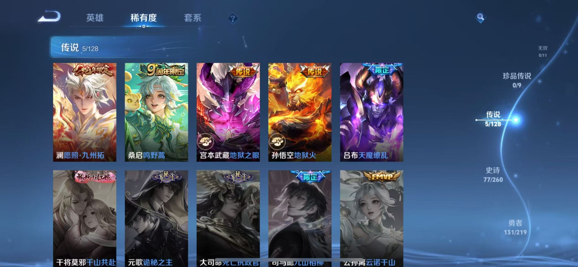 - [11684278]V9 2典藏 1珍品传说 26传说 124英雄 309皮肤 可修改实名 优质装备:鸣剑·曳影,银白咏叹调(倪克斯侍卫),怪盗基德,云鹰飞将(小将军),久胜战神,一念神魔,云霓雀翎,末日机甲-孙尚香(绿蚂蚱),仲夏夜之梦(大飞蛾),零号·赤焰,胖达荣荣,游龙清影(小青龙),淬星耀世,挚爱之约,无双飞将,碎云,山海·炽霜斩(李信年限),鹤归松栖(云缨),大乔-时之奇旅,澜逐花归海,金乌负日,黄金天蝎座 珍宝阁皮:妄想食味,女武神,玩趣恶龙 限定皮:逐霄战戟,映山客,鸣野蒿,至尊宝,武陵仙君(小桃花),傲雪梅枪,绯月行,高山流水,匿光决锋者,五谷丰年,游园惊梦,逐梦之音,祈雪灵祝(雪兔子),李小龙,霸王别姬-虞姬,孙行者,猪悟能,青春决赛季,热情桑巴,匿光追影者,寅虎·瑞焰(虎皮蛋子),寅虎·心曲(虎婆),百木心枪,玉兔公主,山海·玄木吟(马可年限) 史诗皮:星界战将,破空之剑,涂山红红,埋骨钱,芈月浮光幕影,上官婉儿群星魔术团,蔬乡物语(鲁班七号),乘龙·聚宝船(安琪拉年限),百相守梦-百里守约,紫霞仙子,苍穹之光,黄金分割率,特工魅影,永昼,百相守梦(关羽),电玩·爆裂旋风,鹤归松栖(赵怀真),江河有灵,蒙恬荣光圣徽,龙骑士(小龙虾),白蛇,暗夜猫娘,魅语,晚萤,冰冠公主,末日机甲-吕布,时之恋人-孙尚香,乱世虎臣,节奏热浪,修罗,女仆咖啡,摇滚巨星,水果甜心,绅士熊喵,天才门将,星夜王子,心灵骇客,功夫厨神,德古拉伯爵,暗隐猎兽者,幽灵船长,鬼剑武藏,心灵战警,乐园奇幻夜,舞动绿茵,地狱岩魂,拒霜思,缤纷独角兽,乘风破浪,逐浪之夏,月团寄思,水晶猎龙者,曙光守护者,箭羽风息,唤灵魅影,金属风暴,原初追逐者,圣诞狂欢,圣诞恋歌,鹰眼统帅,暗夜贵公子,魅力维加斯,黎明之约,奇遇舞章,无心,未来纪元-赵云