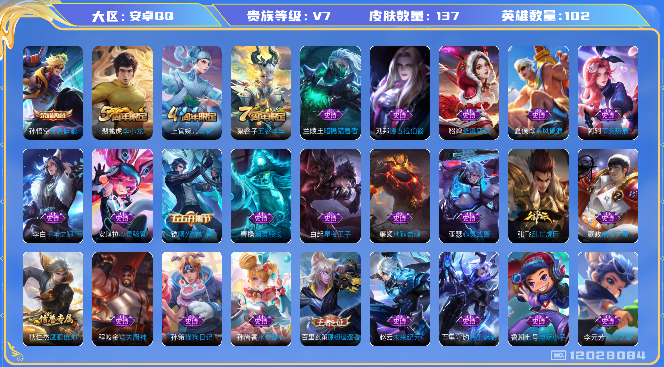 [12028084]V7 1典藏 102英雄 137皮肤 可修改实名 优质装备:全息碎影(猴子典藏) 珍宝阁皮:优雅恋人 限定皮:五谷丰年,梁祝,李小龙 史诗皮:电玩小子(小书包),黄金分割率,特工魅影,千年之狐,偶像歌手,猫狗日记-孙策,乱世虎臣,节奏热浪,女仆咖啡,摇滚巨星,水果甜心,天才门将,星夜王子,心灵骇客,功夫厨神,德古拉伯爵,暗隐猎兽者,幽灵船长,心灵战警,地狱岩魂,繁星吟游(呼啦呼啦),乘风破浪,逐浪之夏,曙光守护者,金属风暴,原初追逐者,圣诞狂欢,圣诞恋歌,鹰眼统帅,魅力维加斯,未来纪元-赵云