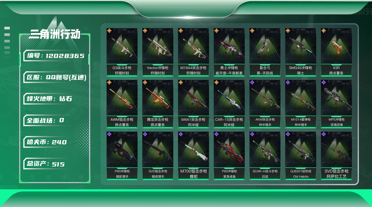 [12028365]总资产:515.6M 11传说枪械 哈夫币:240K 可二次 可修改实名 烽火地带段位:钻石 全面战场段位:上等兵 传说武器皮肤:勇士冲锋枪-能天使-午夜邮差,腾龙突击步枪-捞点薯条,93R-捞点薯条,AWM狙击步枪-捞点薯条,SMG45冲锋枪-骑士,M16A4突击步枪-狩猎时刻,M4A1突击步枪-阿米娅,CAR-15突击步枪-阿米娅,复合弓-黑-天际线,Vector冲锋枪-狩猎时刻,G3战斗步枪-狩猎时刻 史诗武器皮肤:PKM通用机枪-蝮蛇,M700狙击步枪-蝮蛇,P90冲锋枪-暗影猎手,M1014霰弹枪-林中猎手,SCAR-H战斗步枪-囚徒,SV-98狙击步枪-林中猎手,PTR-32突击步枪-英雄,SV-98狙击步枪-囚徒,P90冲锋枪-紧急戒备,QJB201轻机枪-Old Habits,M16A4突击步枪-竞赛选手,SVD狙击步枪-暗夜猎手,SVD狙击步枪-阿萨拉工艺,MP5冲锋枪-深海恐惧,AKM突击步枪-林中猎手,M700狙击步枪-竞技风