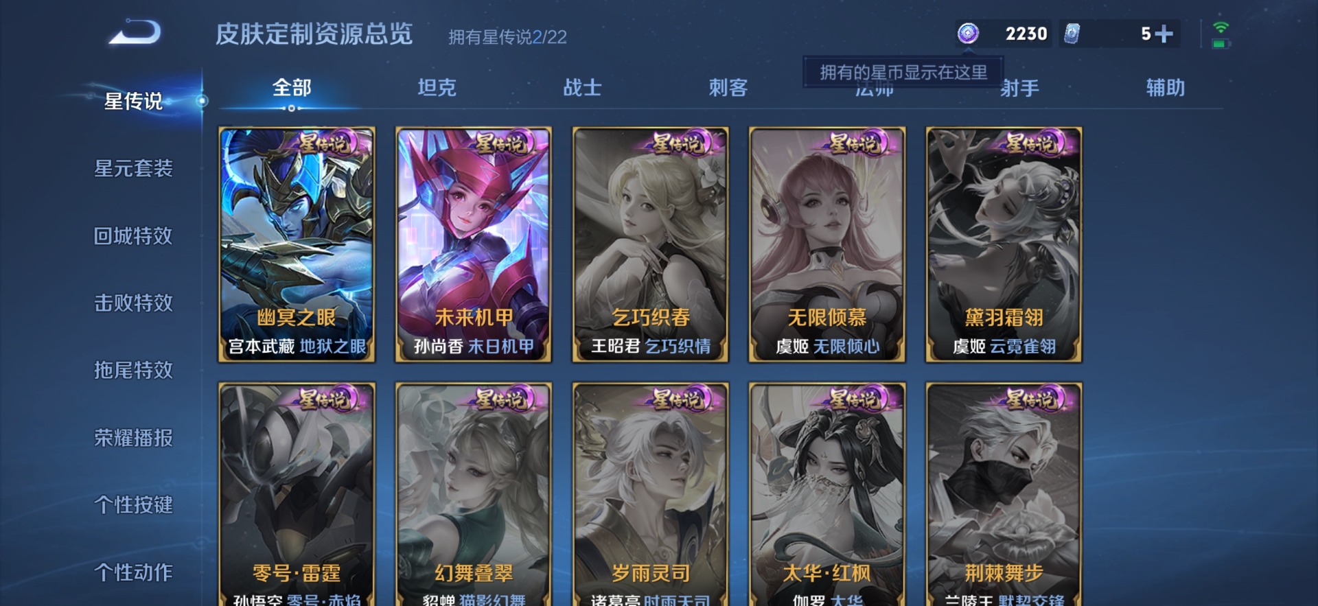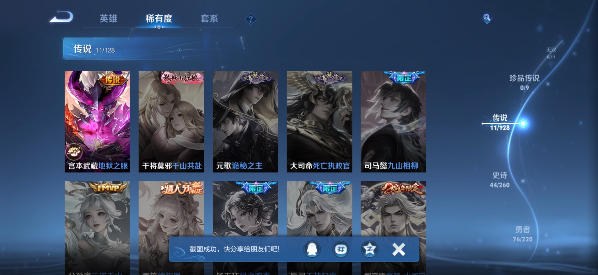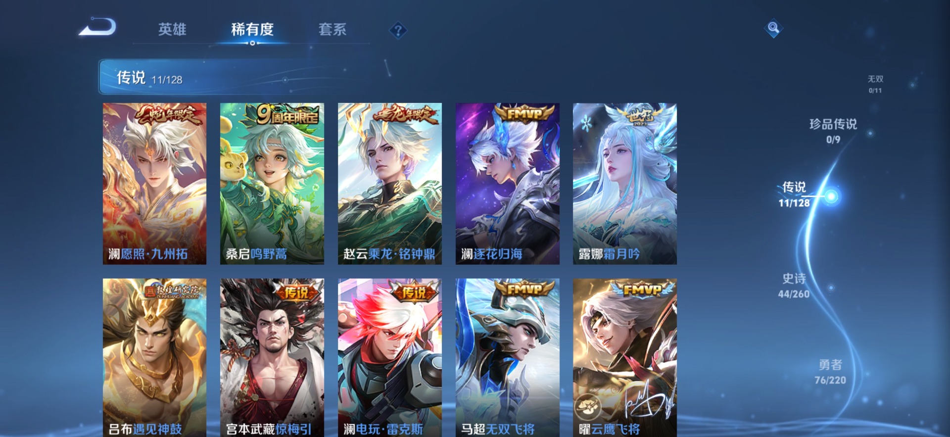 - PX_2106460-Q/至尊星耀/244皮肤/124英雄/1典藏/0珍品无双/0无双/2珍品传说/17传说/57史诗/8稀有英雄 【2 珍品传说】怪盗基德 马可波罗,江户川柯南 鲁班七号, 【1 典藏皮肤】最初的交响 伽罗, 【17 传说皮肤】启明星使 虞姬,无双飞将 马超,零号·赤焰 孙悟空,地狱火 孙悟空,云鹰飞将 曜,记忆之芯 公孙离,炽阳神光 镜,霜月吟 露娜,黄金狮子座 达摩,战鼓燎原