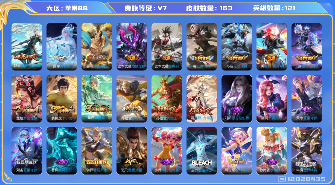 [12028435]V7 11传说 121英雄 163皮肤 可修改实名 优质装备:云鹰飞将(小将军),地狱之眼,无双飞将,电玩·雷克斯,惊梅引,遇见神鼓,霜月吟,澜逐花归海 传说皮:乘龙·铭钟鼎(赵云年限) 珍宝阁皮:妄想食味 限定皮:愿照·九州拓(澜年限),鸣野蒿,游园惊梦,李小龙,孙行者,美猴王 史诗皮:器灵·浮梦炉,星界战将,谪仙醉月,石田雨龙,东方月初,百相守梦-黄忠,苍穹之光,特工魅影,江河有灵,鹤归松栖(赵怀真),百解令(蒙犽),蒙恬荣光圣徽,偶像歌手,电玩·爆裂旋风,百相守梦(刘备),龙骑士(小龙虾),乱世虎臣,节奏热浪,水果甜心,绅士熊喵,功夫厨神,德古拉伯爵,暗隐猎兽者,幽灵船长,鬼剑武藏,暗渊魔法,缤纷独角兽,水晶猎龙者,箭羽风息,鹰眼统帅,黎明之约,赏金猎手,无心