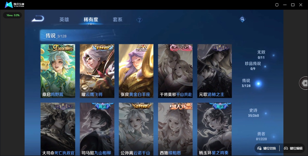 - [12112806]V5 1典藏 2传说 98英雄 58皮肤 可修改实名 优质装备:鸣剑·曳影 传说皮:九山相柳 限定皮:愿照·山河定(司空震年限) 史诗皮:化蝶舞,龙之律动,百相守梦-周瑜,百相守梦-黄忠,特工魅影,时之恋人-孙尚香,摇滚巨星,天才门将,鬼剑武藏,暗渊魔法,鹰眼统帅