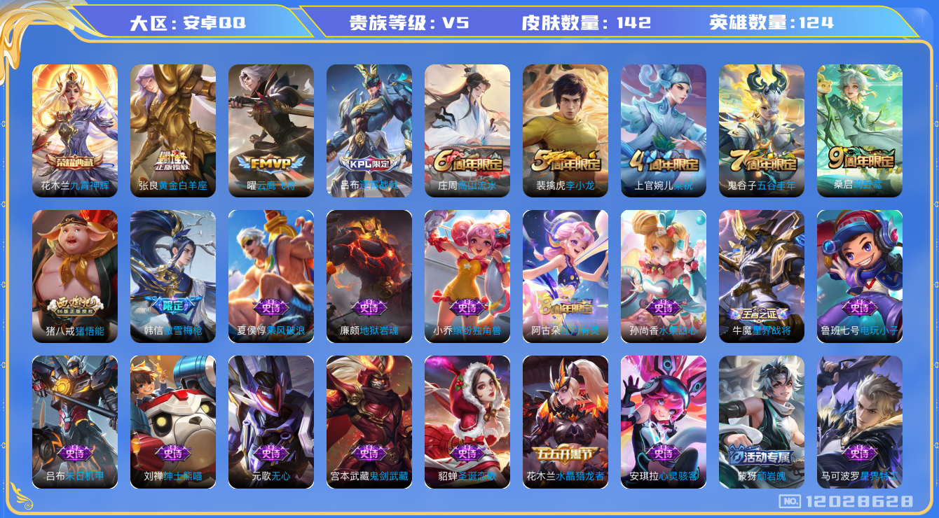 - [11554156]实名: 可修改 贵族等级: V6 英雄数: 123 皮肤数: 209 荣耀水晶: 拾光映像 珍品传说: 大耳狗之梦 传说皮: 仲夏夜之梦,游龙清影 限定皮: 遇见飞天,梁祝,白晶晶,奇迹圣诞,默契交锋-花木兰,霸王别姬-项羽,霸王别姬-虞姬,高山流水,时之祈愿-云中君,时之祈愿-瑶,五谷丰年,鸣野蒿