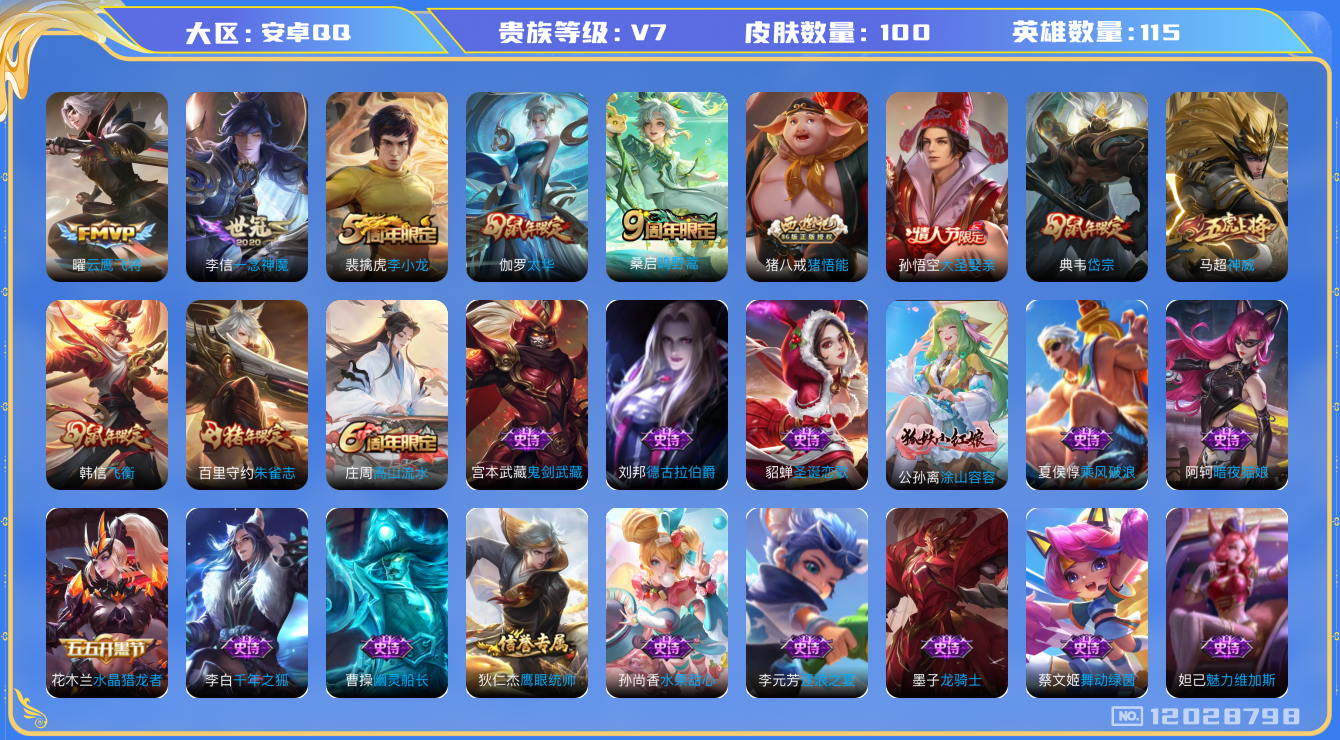 [12028798]V7 4传说 115英雄 100皮肤 可修改实名 优质装备:云鹰飞将(小将军),一念神魔,涂山容容 珍宝阁皮:女武神 限定皮:鸣野蒿,太华(伽罗年限),神威(电光马子),飞衡(韩信年限),高山流水,岱宗(典韦年限),李小龙,朱雀志(守约年限),猪悟能,大圣娶亲 史诗皮:千年之狐,暗夜猫娘,龙骑士(小龙虾),修罗,水果甜心,德古拉伯爵,幽灵船长,鬼剑武藏,舞动绿茵,乘风破浪,逐浪之夏,水晶猎龙者,圣诞恋歌,鹰眼统帅,魅力维加斯