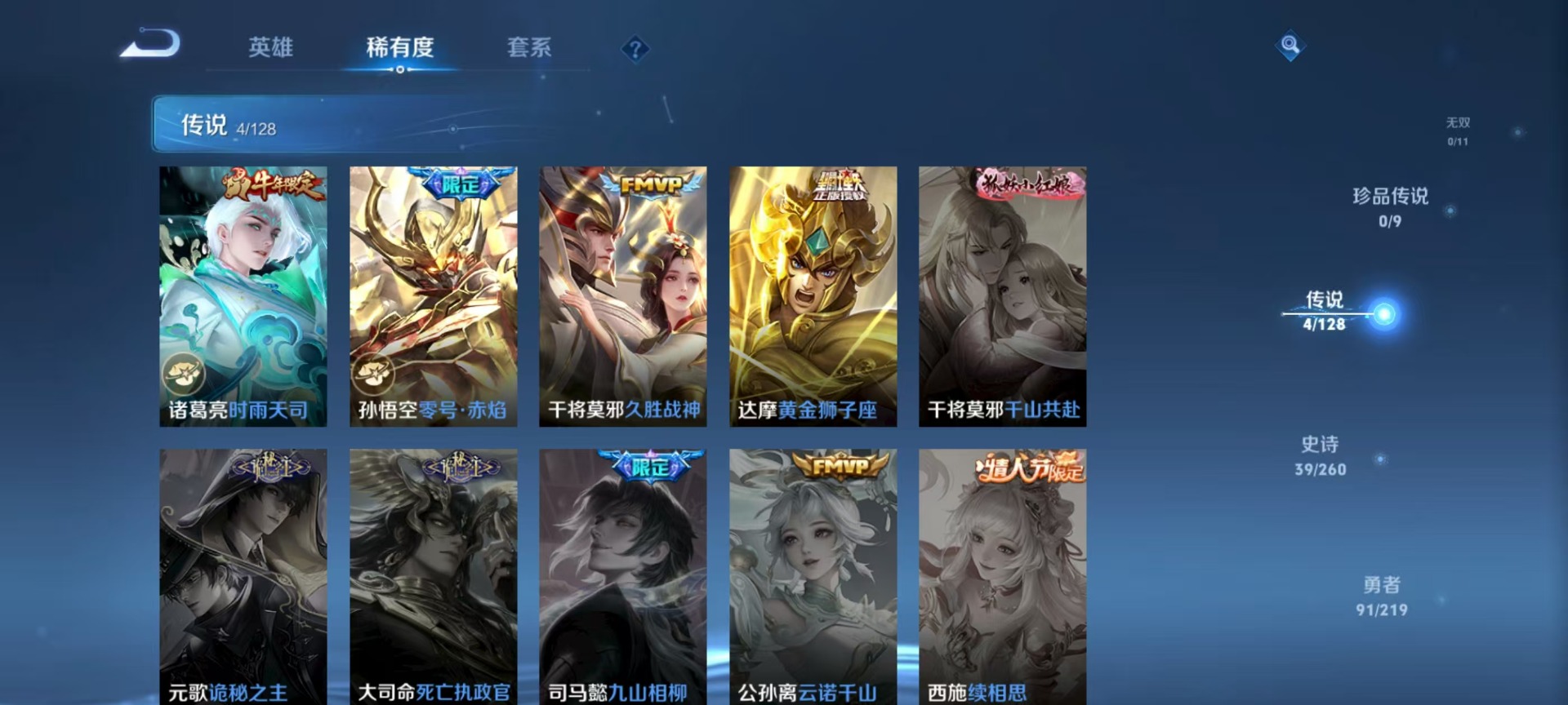 - PX_2085784-12 安卓QQ/永恒钻石/206皮肤/124英雄/1典藏/0珍品无双/1无双/0珍品传说/28传说/65史诗/8稀有英雄 【1 典藏皮肤】九霄神辉 花木兰, 【1 无双皮肤】群星魔术团 韩信, 【28 传说皮肤】鹤归松栖 云缨,启明星使 虞姬,时之祈愿 瑶,电玩·雷克斯 澜,无双飞将 马超,云鹰飞将 曜,齐天大圣 孙悟空,凤求凰 李白,诗剑行 李白,灼幽烈阳 东皇太一,浮生妄
