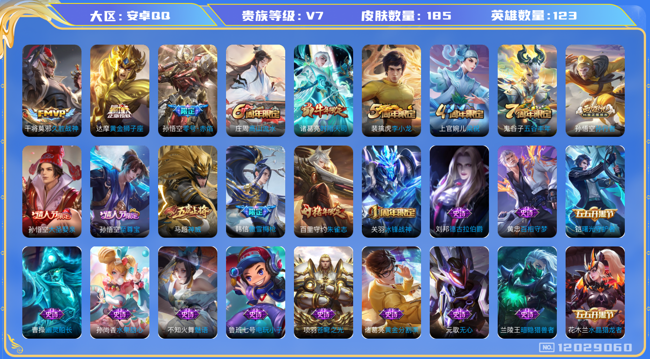 [12029060]V7 4传说 123英雄 185皮肤 可修改实名 优质装备:黄金狮子座,久胜战神,零号·赤焰 珍宝阁皮:蔷薇恋人 限定皮:至尊宝,傲雪梅枪,时雨天司(水龙头),神威(电光马子),高山流水,五谷丰年,冰锋战神,梁祝,李小龙,朱雀志(守约年限),孙行者,大圣娶亲 史诗皮:百相守梦-黄忠,苍穹之光,电玩小子(小书包),黄金分割率,特工魅影,魅语,修罗,女仆咖啡,水果甜心,功夫厨神,德古拉伯爵,暗隐猎兽者,幽灵船长,纤云弄巧,拒霜思,水晶猎龙者,曙光守护者,金属风暴,鹰眼统帅,魅力维加斯,无心
