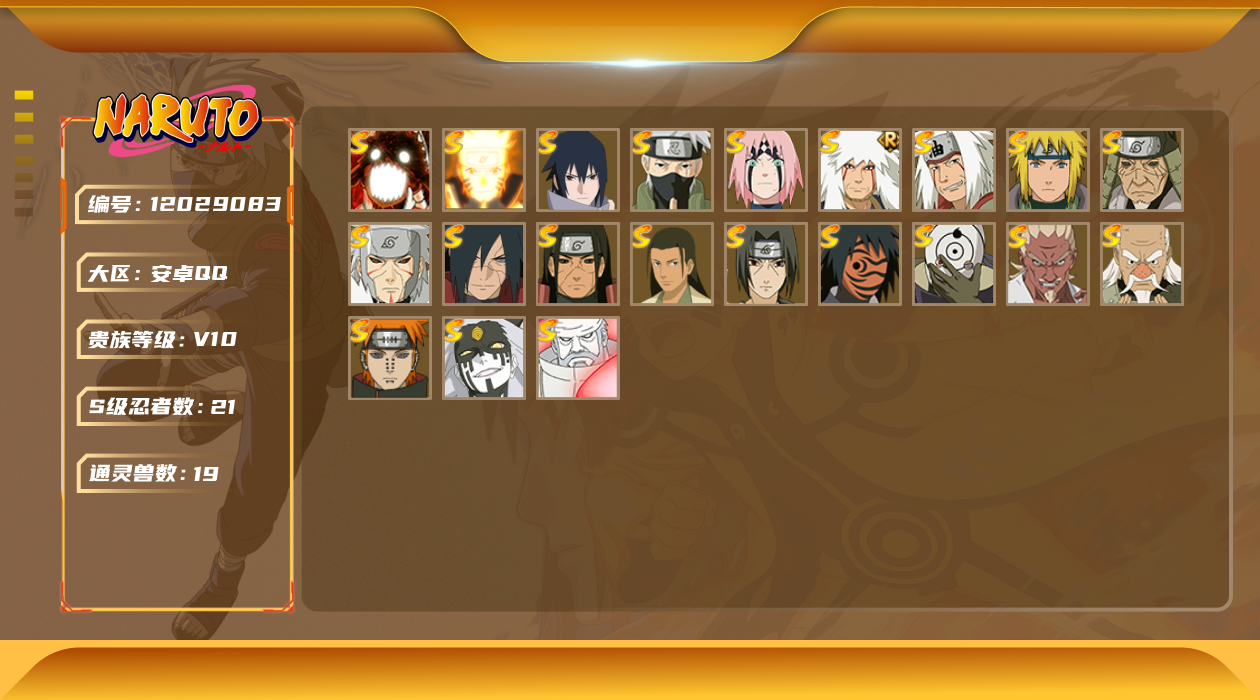 [12029083]V10 21S忍 35A忍 19通灵 1002.6W战力 可二次 可修改实名 优质装备:熊猫,千手柱间「秽土转生」,千手扉间「秽土转生」,猿飞日斩「秽土转生」,“宇智波斑” 「白面具」,漩涡鸣人 「九喇嘛连结」,大筒木金式「博人传」,春野樱 「忍界大战」,神秘面具男 「红夜之刃」,宇智波佐助「永恒万花筒」,千手柱间·木叶创立,宇智波斑「秽土转生·解」,大筒木桃式,艾「忍界大战」,旗木卡卡西「须佐能乎」,自来也 「传说中的三忍」,漩涡鸣人 「暴怒·第六尾」 S级忍者:大野木 「忍界大战」,自来也 「舞之豪杰」,宇智波鼬 「须佐能乎」,佩恩「天道」,波风水门