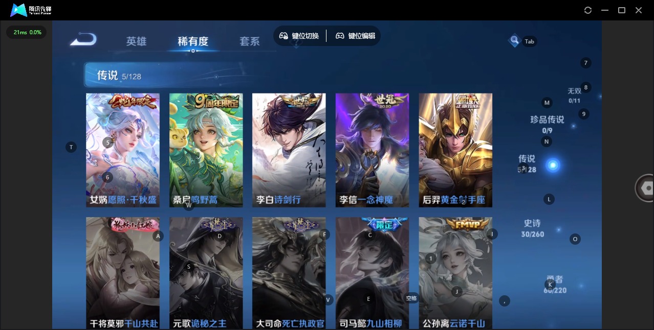 - [11608459]V7 6传说 124英雄 149皮肤 可修改实名 优质装备:黄金白羊座,地狱火,淬星耀世,遇见胡旋,无双飞将 珍宝阁皮:蔷薇恋人 限定皮:鸣野蒿,五谷丰年,御风骁将(吕布年限),李小龙,逐梦之影,霸王别姬-虞姬,默契交锋-花木兰,孙行者,匿光追影者 史诗皮:化蝶舞,百相守梦-百里守约,电玩小子(小书包),特工魅影,千年之狐,冰冠公主,偶像歌手,乱世虎臣,摇滚巨星,水果甜心,绅士熊喵,天才门将,功夫厨神,德古拉伯爵,暗隐猎兽者,幽灵船长,鬼剑武藏,纤云弄巧,拒霜思,缤纷独角兽,乘风破浪,逐浪之夏,水晶猎龙者,箭羽风息,金属风暴,原初追逐者,圣诞恋歌,鹰眼统帅,魅力维加斯,黎明之约,赏金猎手,未来纪元-赵云
