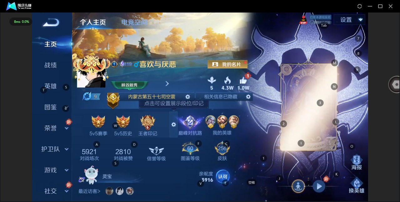 - [11547975]V5 1传说 103英雄 85皮肤 可修改实名 优质装备:地狱之眼 珍宝阁皮:蔷薇恋人 限定皮:神威(电光马子),天狼溯光者,李小龙,猪悟能,大圣娶亲 史诗皮:白龙吟,猫狗日记-孙策,德古拉伯爵,心灵战警,纤云弄巧,繁星吟游(呼啦呼啦),圣诞狂欢,鹰眼统帅,魅力维加斯,未来纪元-赵云